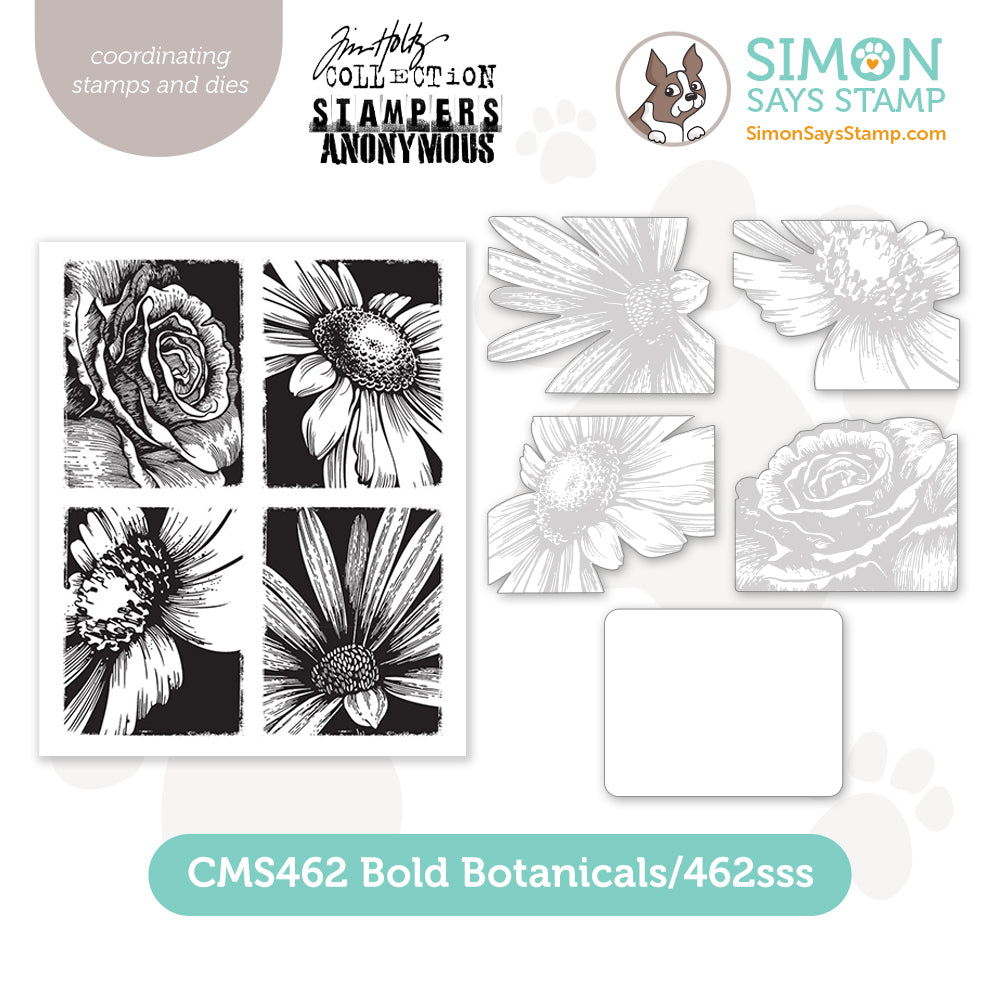 This bundle includes the Tim Holtz Bold Botanicals Cling Rubber Stamps and the Simon Says Stamp Bold Botanicals coordinating dies.