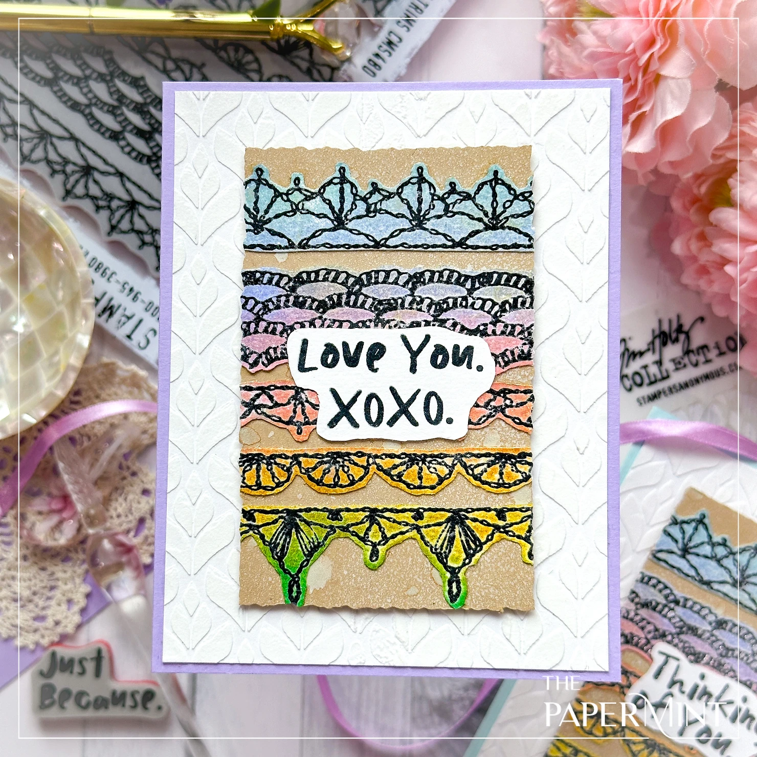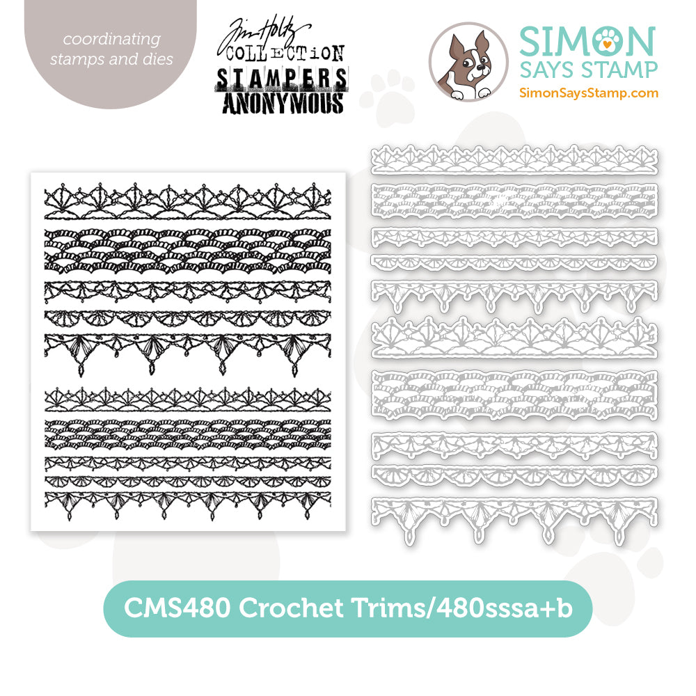 This bundle includes the Tim Holtz Crochet Trims Cling Rubber Stamps, the Simon Says Stamp Crochet Trims Thick Set coordinating dies, and the Simon Says Stamp Crochet Trims Thin Set coordinating dies.