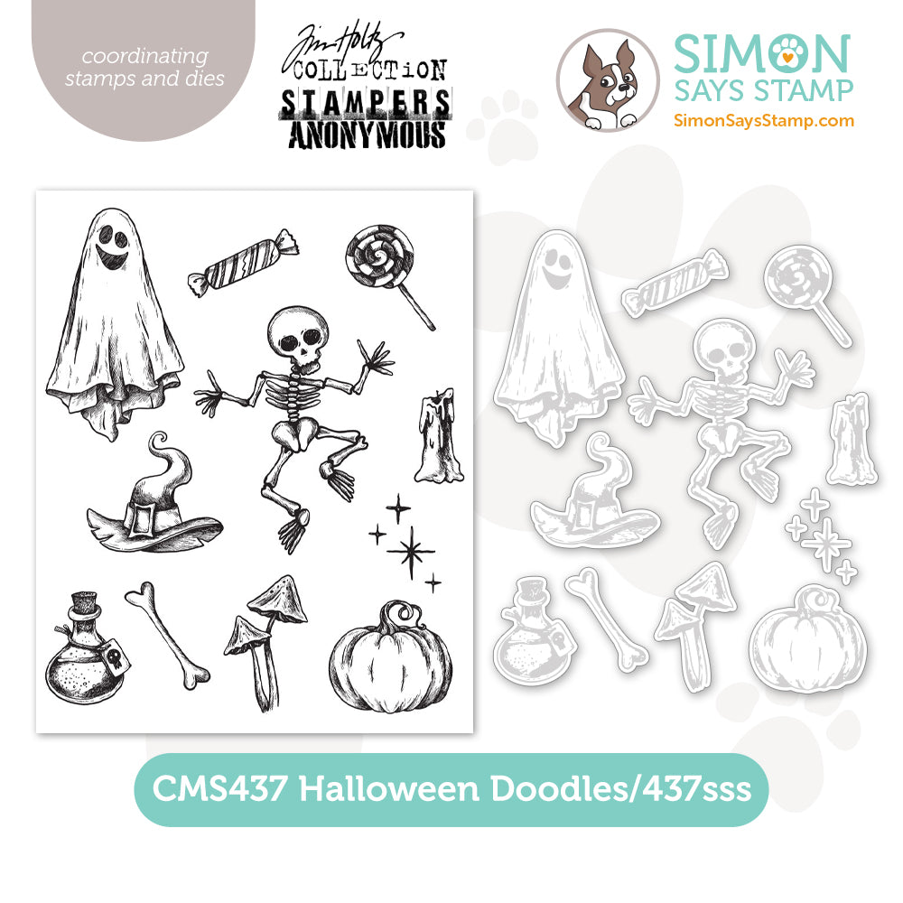 This bundle includes the Tim Holtz Halloween Doodles Cling Rubber Stamps and the Simon Says Stamp Halloween Doodles coordinating dies.