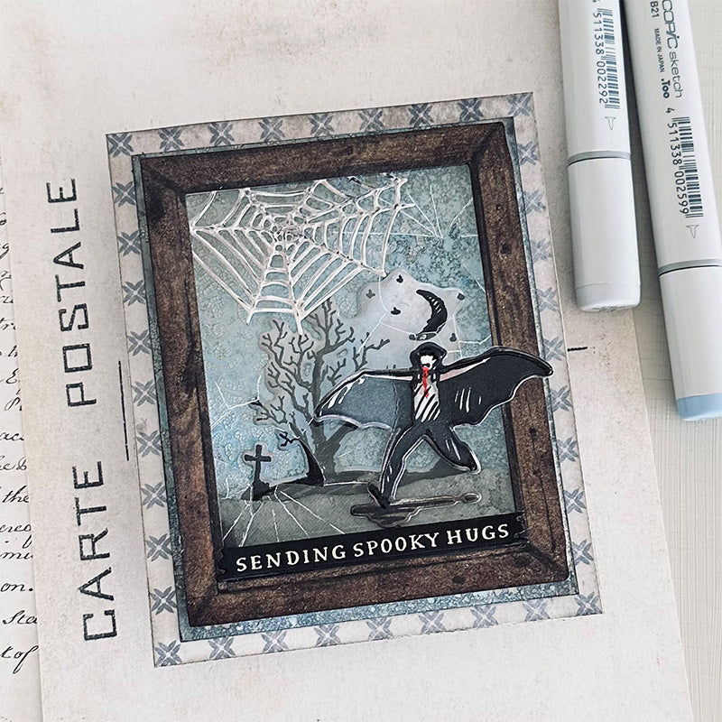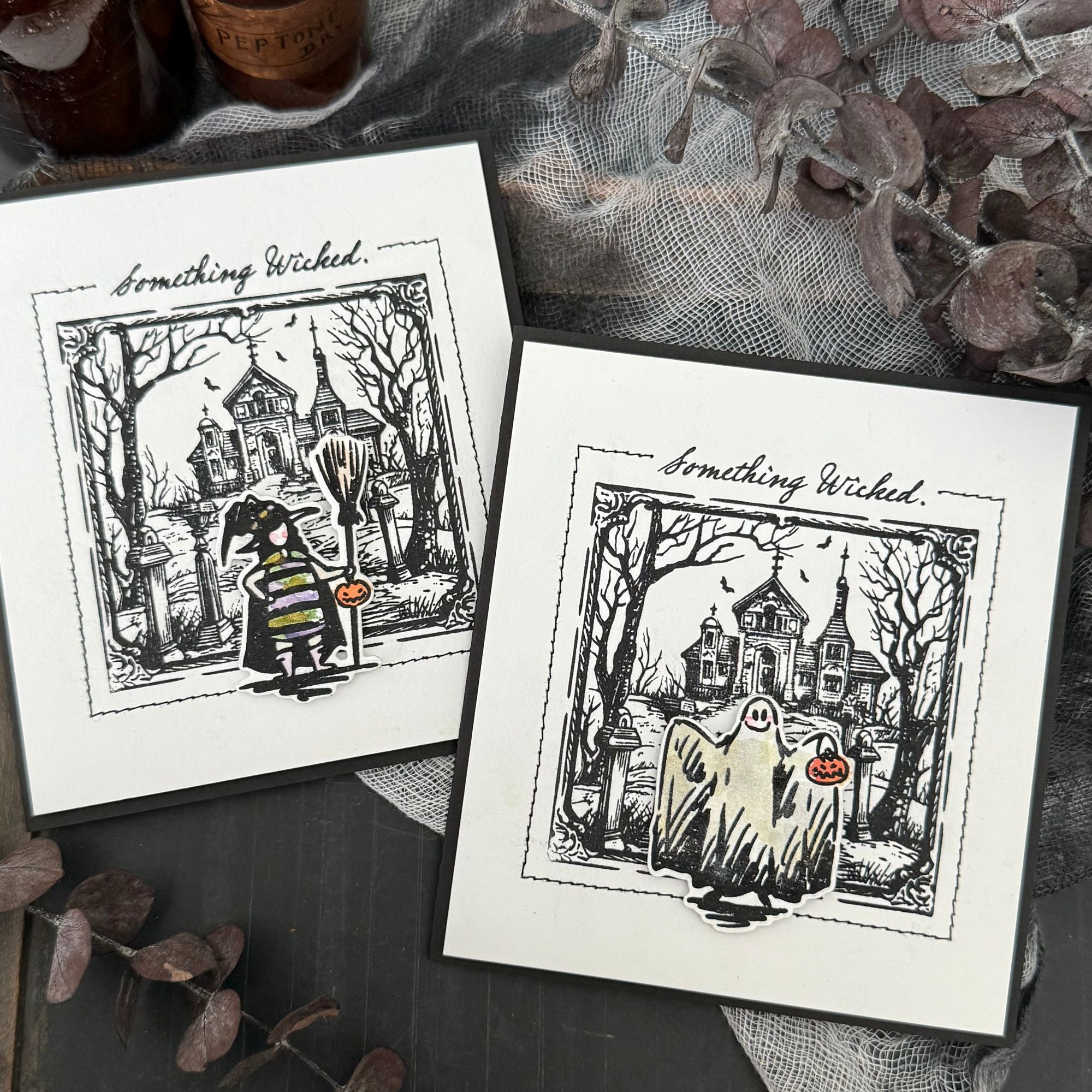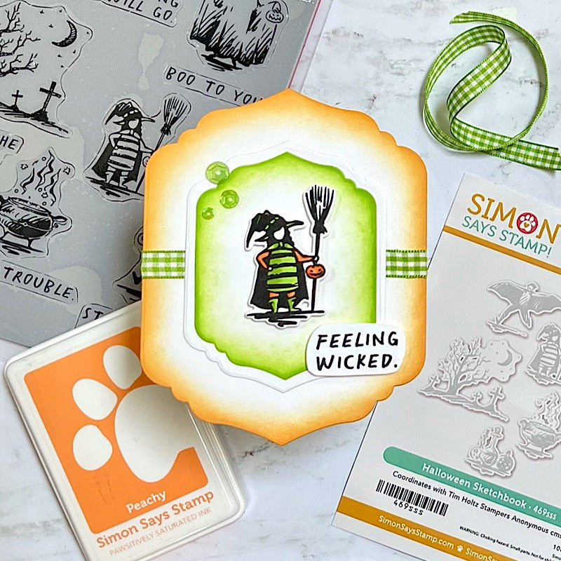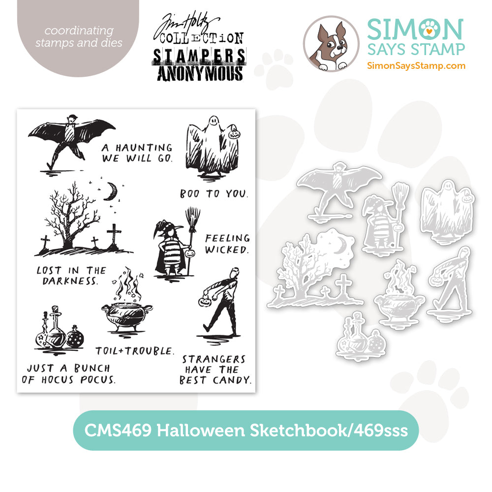This bundle includes the Tim Holtz Halloween Sketchbook Cling Rubber Stamps and the Simon Says Stamp Halloween Sketchbook coordinating dies.