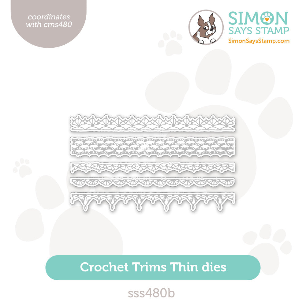This die set includes the dies to cut out 5 of the Thin Crochet Trims. All of the trims measure approximately 6 inches long. The thinnest trim measures approximately 0.25 inches wide. Works beautifully with the five thinner trims in the Tim Holtz CMS480 Crochet Trims stamp set.