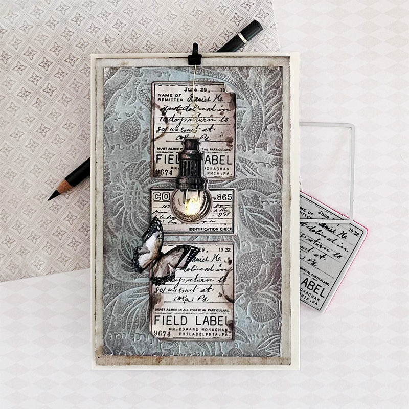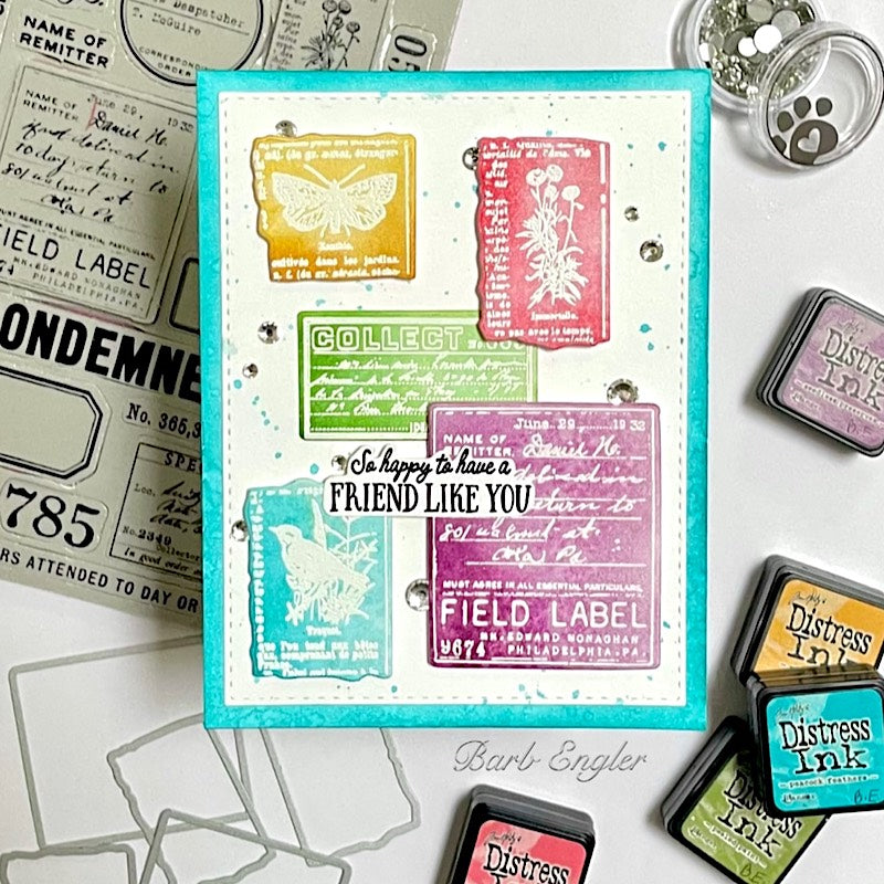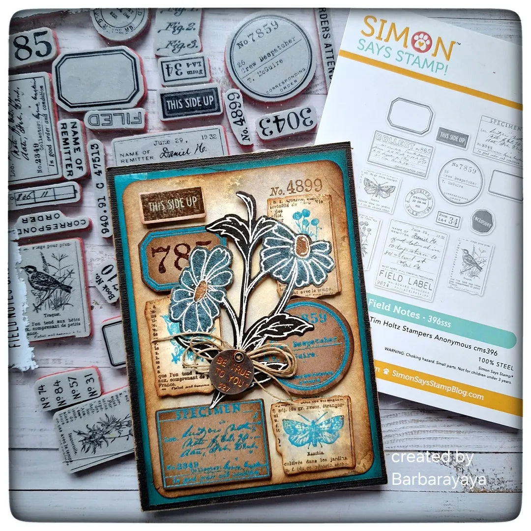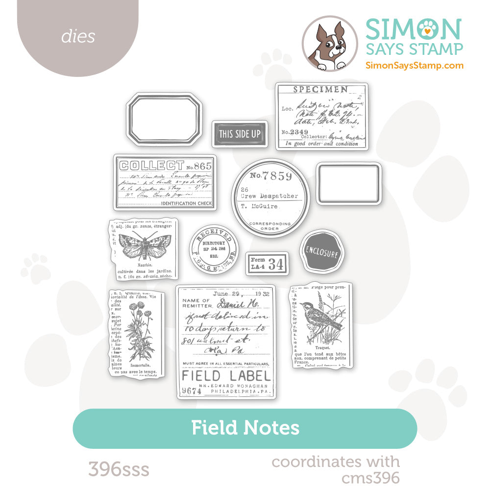 This die set includes the dies to cut out 13 journal labels. The largest die measures approximately 2 inches wide by 2.25 inches tall. The smallest die measures approximately 0.875 inches wide by 0.5 inches tall. Works beautifully with the Tim Holtz CMS396 Field Notes stamp set.