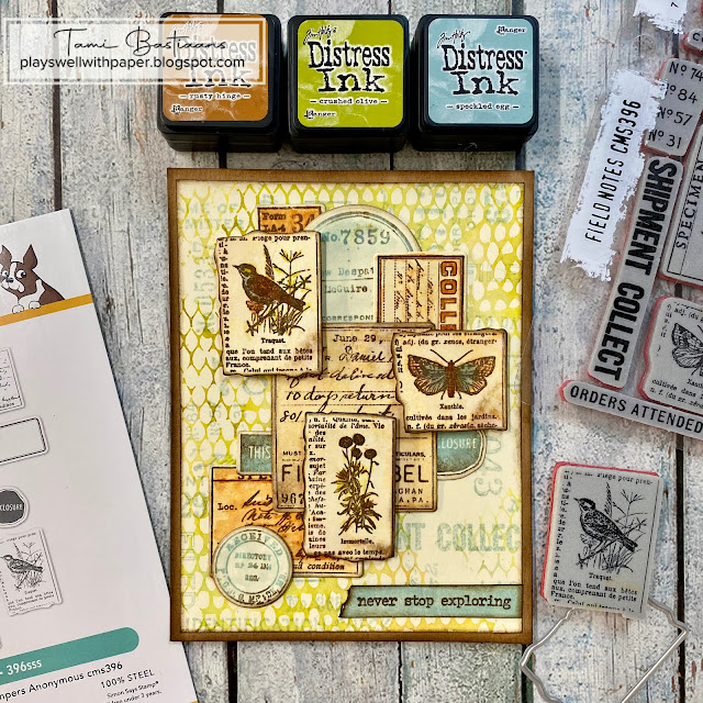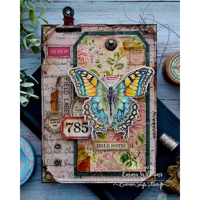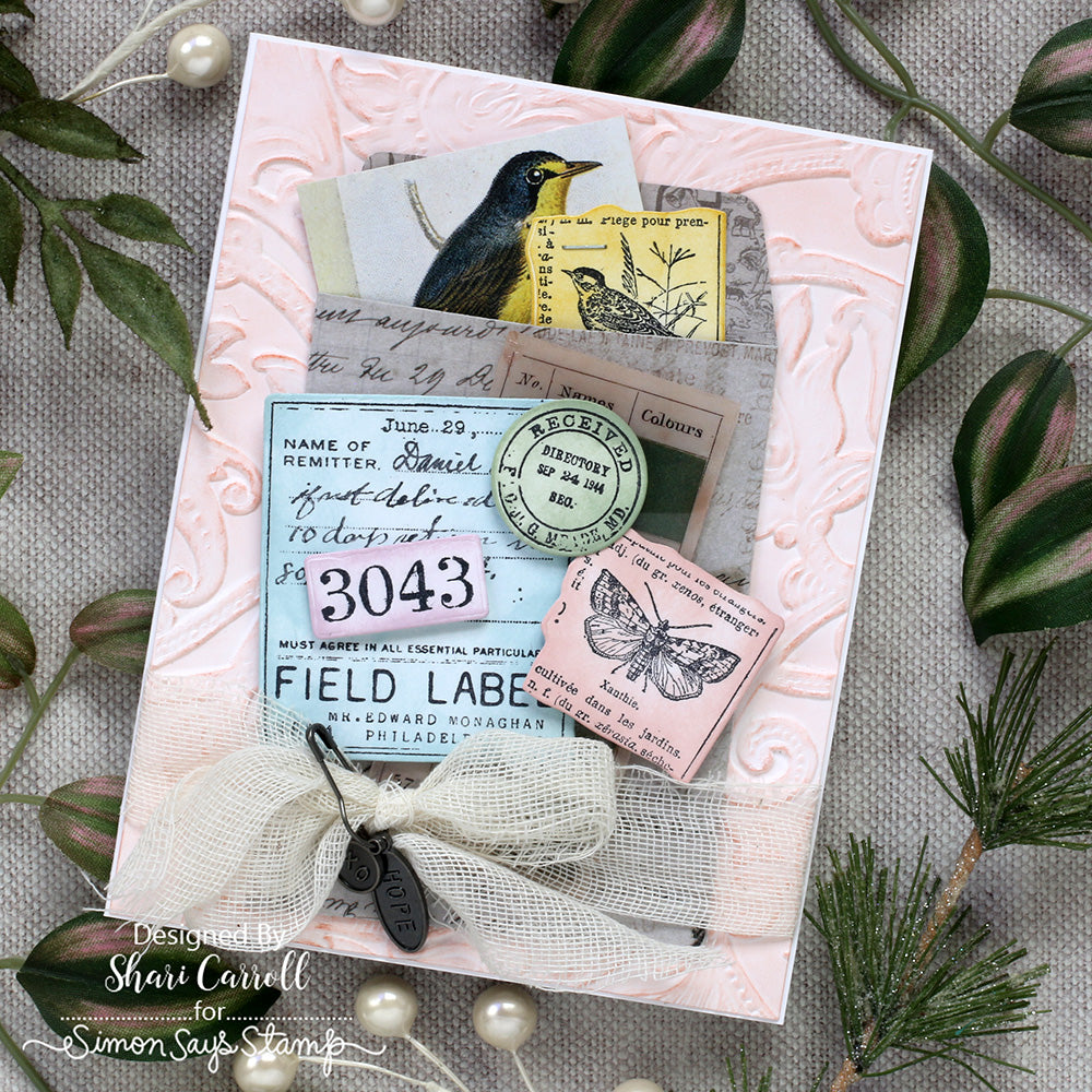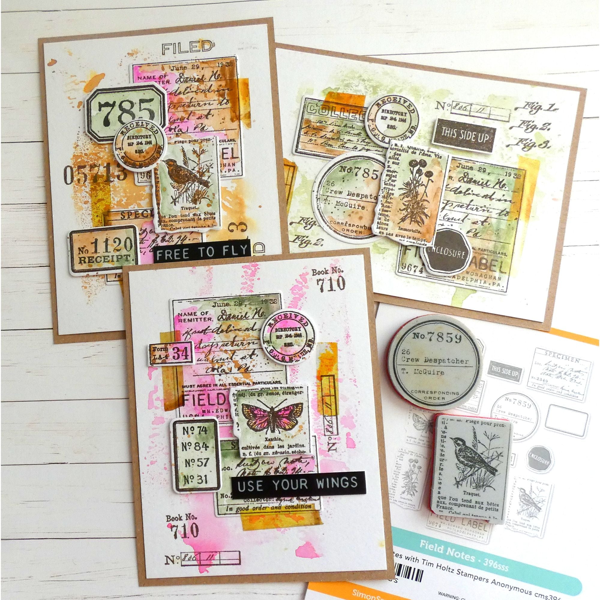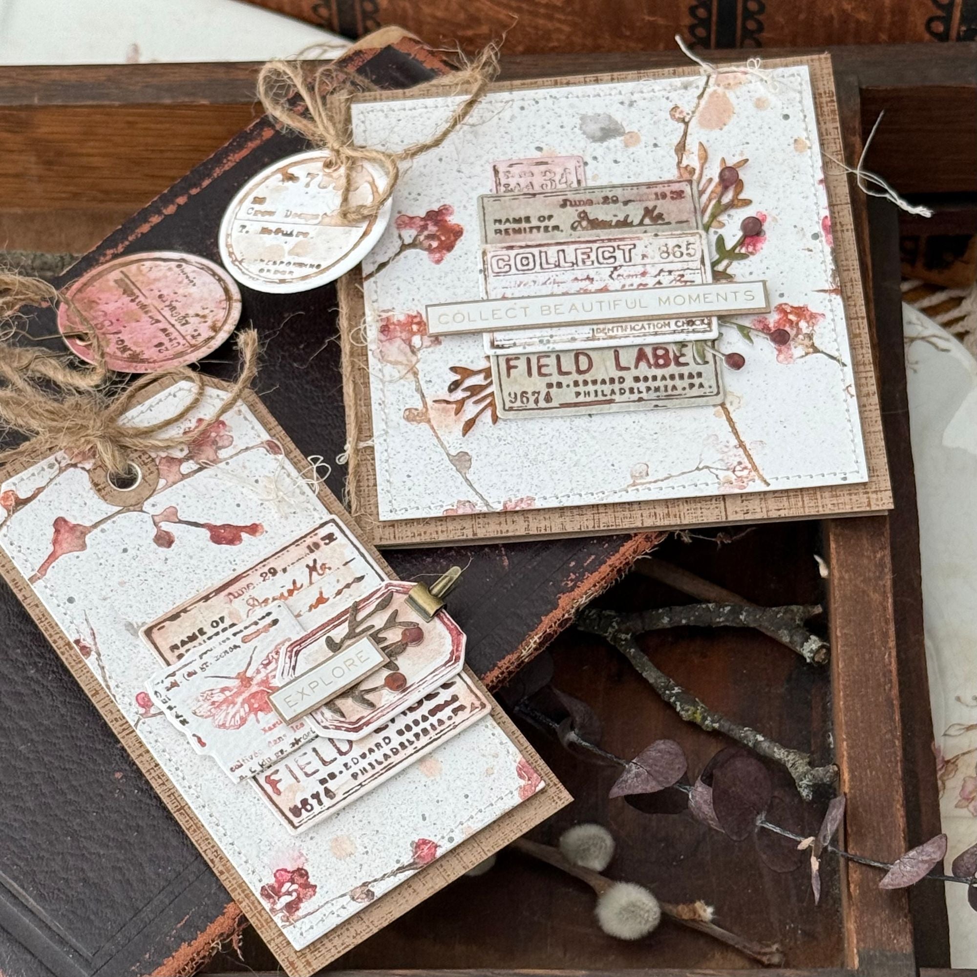 This die set includes the dies to cut out 13 journal labels. The largest die measures approximately 2 inches wide by 2.25 inches tall. The smallest die measures approximately 0.875 inches wide by 0.5 inches tall. Works beautifully with the Tim Holtz CMS396 Field Notes stamp set.