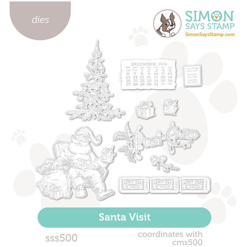 This die set includes the dies to cut out a large Santa Claus sitting in a chair, a Christmas tree, two presents, a bow, a December calendar, postage stamp box, a row of tickets, and a Post Card sentiment. The large Santa Claus sitting in the chair measures approximately 3.25 inches tall by 3.625 inches wide. The smaller present measures approximately 0.75 inches tall by 0.625 inches wide. Works beautifully with the Tim Holtz CMS500 Santa Visit stamp set.