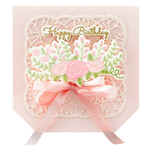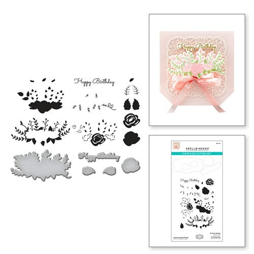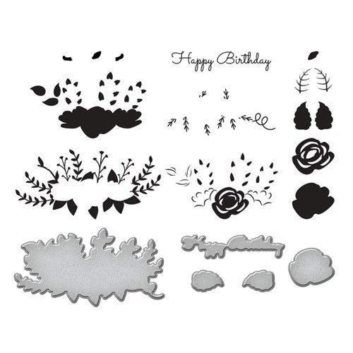 This Lyrical Layered Florals Clear Stamp and Die Set is part of the Sweet Serenade Notecards Collection by Becca Feeken. Color a perfect floral design with this layering stamp set and cut with its coordinating dies. It also includes a Happy Birthday sentiment stamp and die. There are 13 stamps and five thin metal dies in the set.