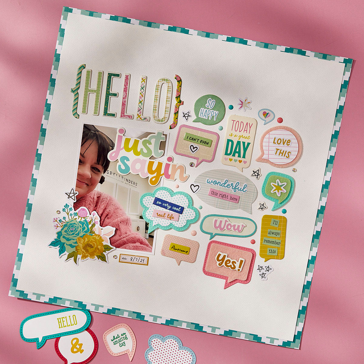 Die Cuts—Some designs include speech bubbles, hearts, coffee cups, arrows, stars, telephones, mailboxes, radios, flowers, books, and cameras, plus words like "hello," "good times," "you da best," and more. Includes two sheets of 83 designs for a total of 166 pieces.