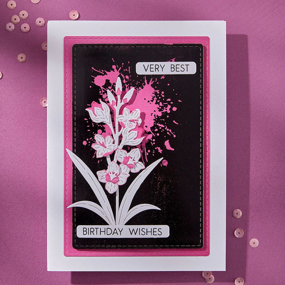 The Layered Gladiolus Etched Dies, from the Wildflowers Collection by Lisa Horton, include 14 thin metal cutting dies that assemble into a stunning Gladiolus flower, complete with its signature trumpet-shaped blooms and graceful leaves. Crafted for layering, this set allows you to build dimension and depth with ease. The finished Gladiolus measures approximately 3 x 4.39 inches (7.60 x 11.20 cm), making it an eye-catching focal point for cards, scrapbooks, and mixed media projects. Compatible with most die-cutting machines.