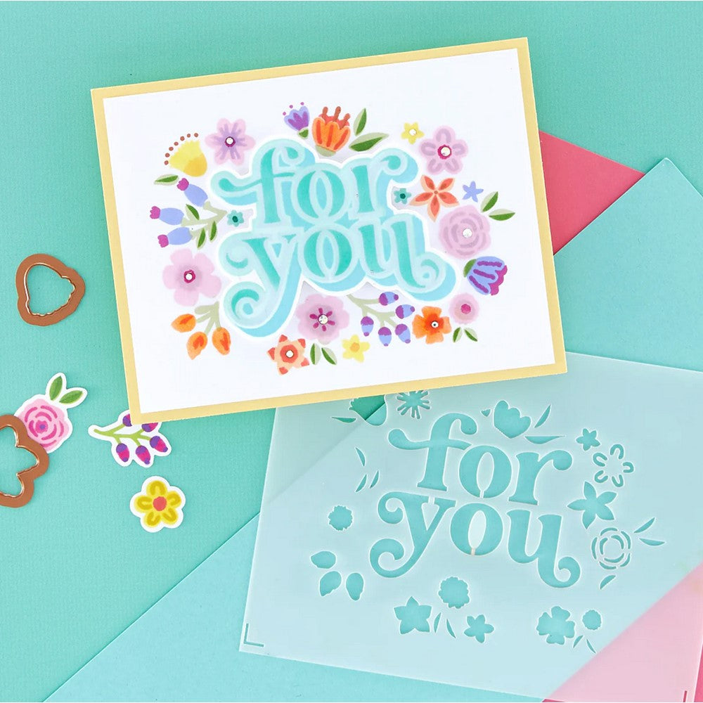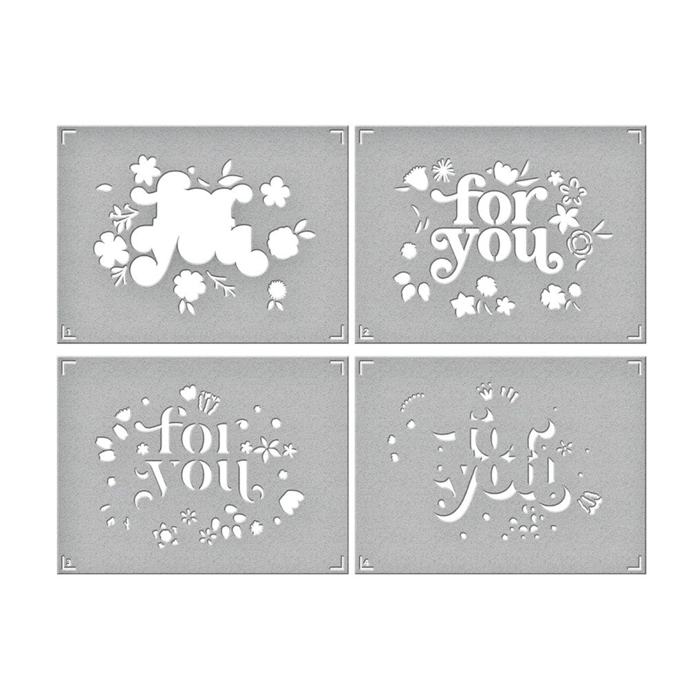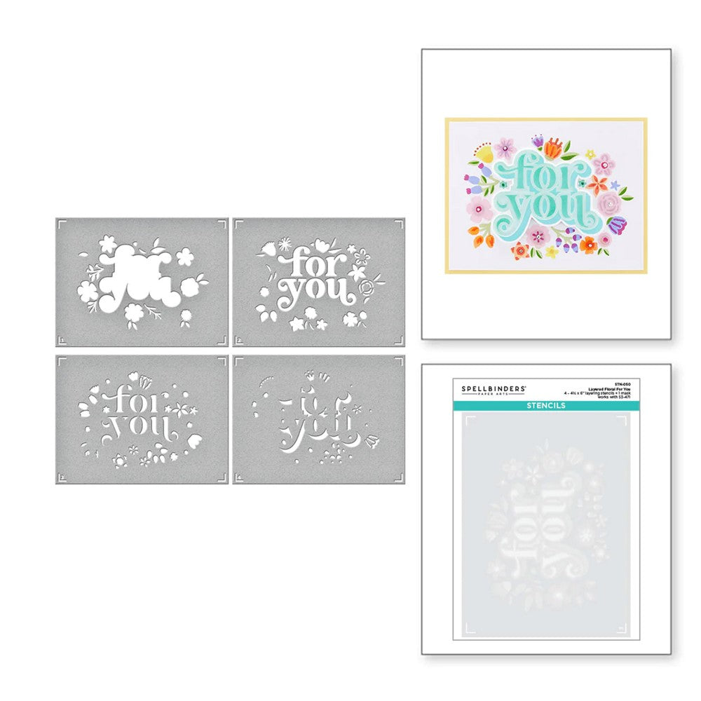 The Spellbinders Layered Floral For You Stencils are a set of stencils made from durable mylar material. The set includes four stencil sheets and a mask piece that can be used to create a beautiful burst of florals framed around the For You sentiment. These stencils are also compatible with the S3-471 Floral For You Etched Dies.