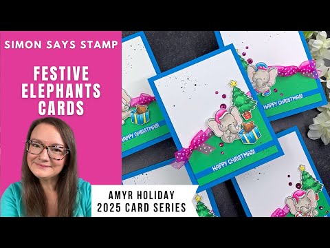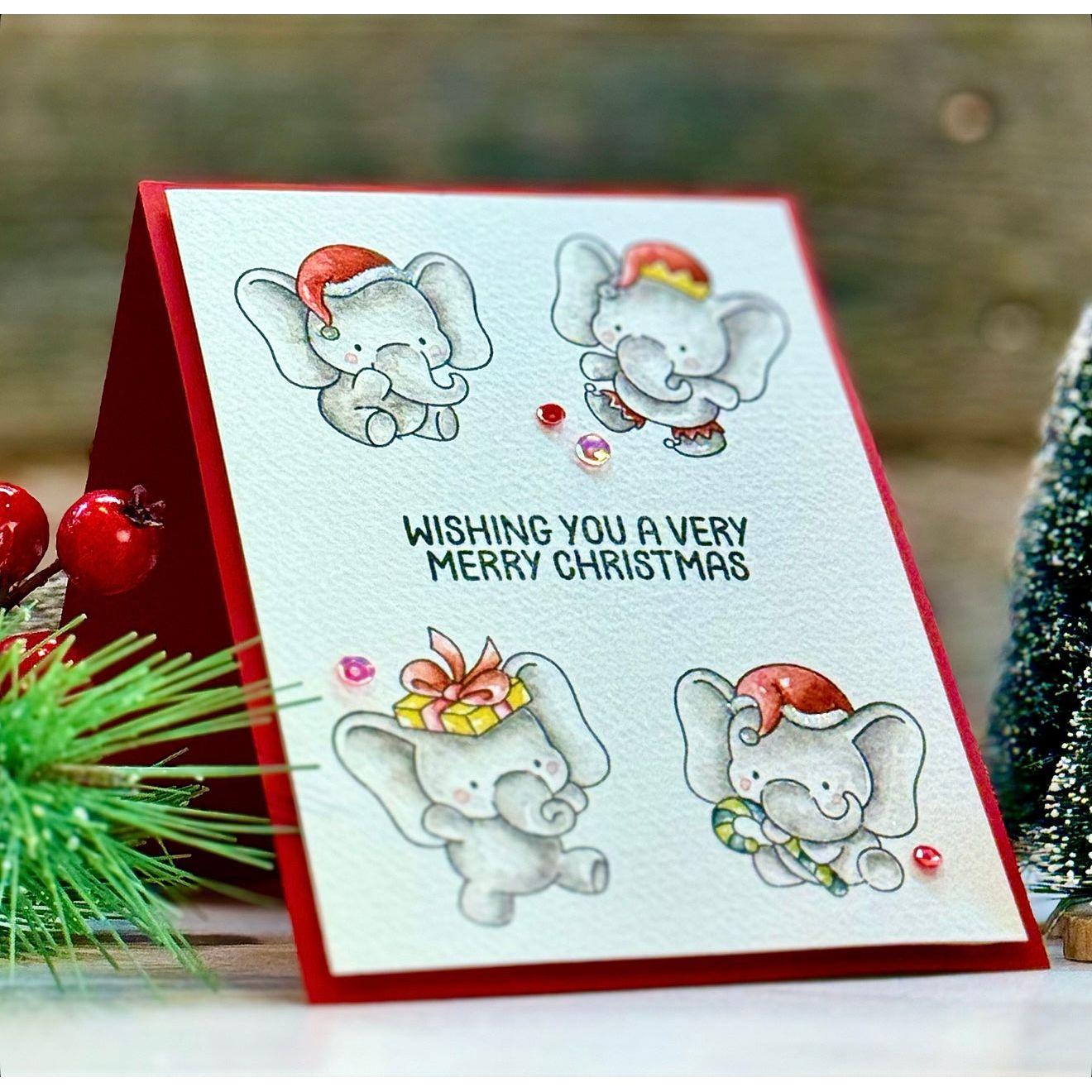 The Simon Says Stamp Festive Elephants stamp set captures the magic of the holidays with adorable elephants adorned in festive hats and wrapped in lights or holding seasonal treats like a gift and a candy cane. Additional images include a tiny critter peeking out from a box and a charming holiday tree, perfect for building a whimsical scene.