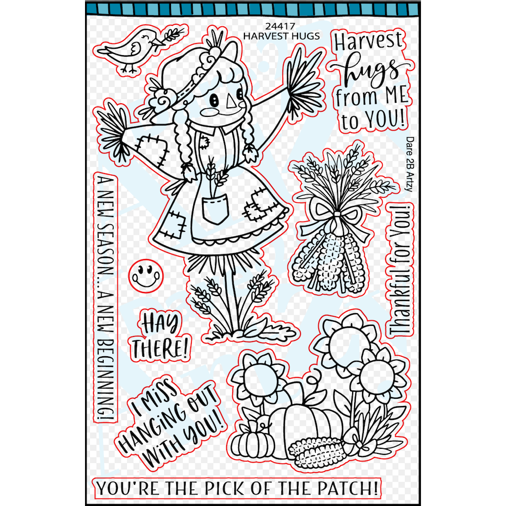 The Dare 2B Artzy Harvest Hugs Clear Stamp Set is perfect for adding warmth and charm to your fall-themed crafting projects. This delightful set features adorable images of scarecrows, leaves, and harvest findings, capturing the essence of autumn. Measuring 4 x 6 inches, it includes 6 heartfelt sentiments that are ideal for expressing gratitude and seasonal cheer. Sentiments include,