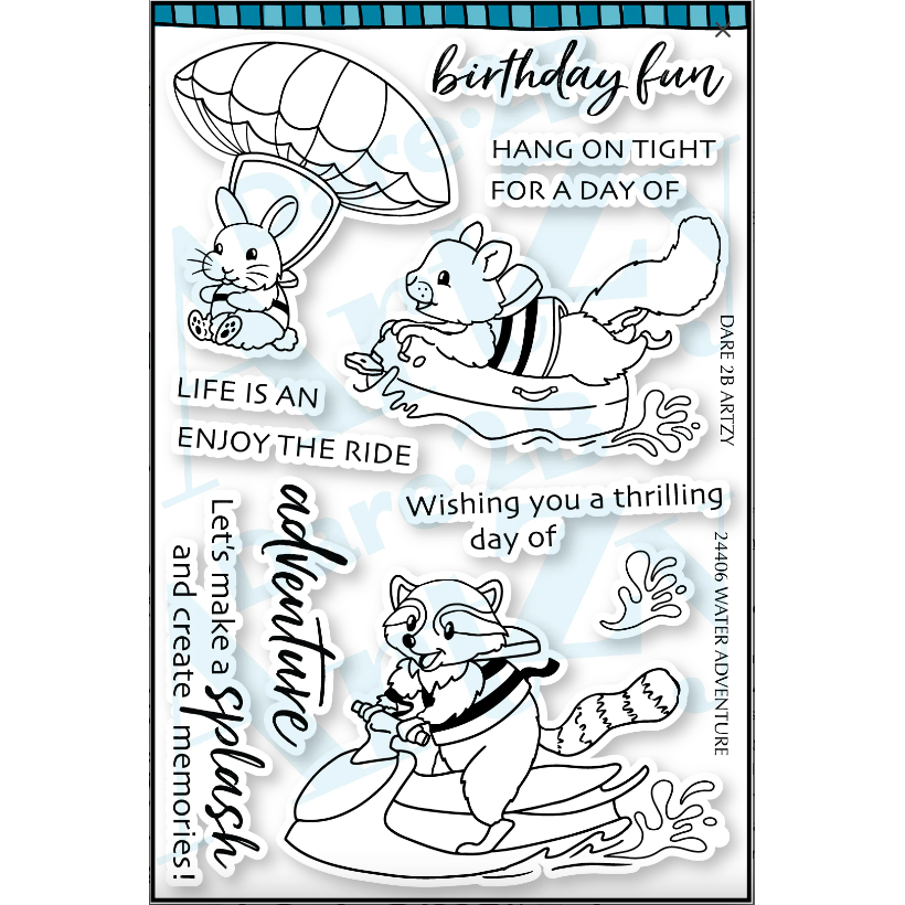 Dive into creativity with the Dare 2B Artzy Water Adventure Clear Stamp Set! Explore the exciting world of water sports and leisure activities with this diverse collection of stamps, featuring exhilarating images and sentiments of jet skiing, tubing, parasailing, and more. Sentiment include,