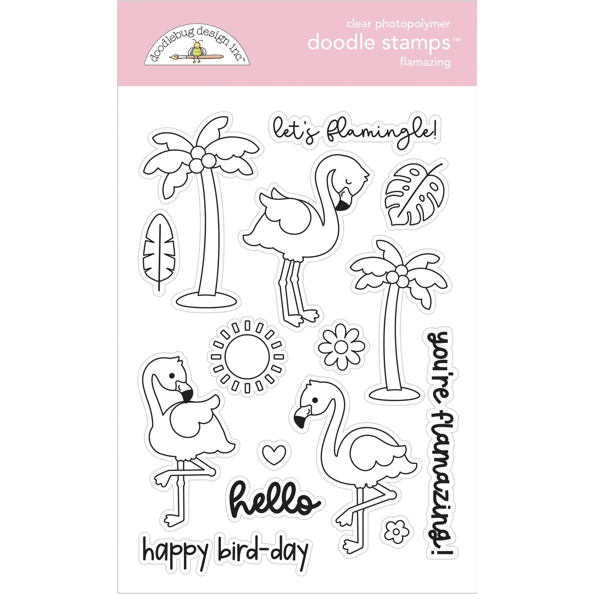 Celebrate your love for flamingos with the Doodlebug Flamazing Doodle Stamps! This 4x6 inch clear set features three unique flamingo poses, two palm trees, a sun, flowers, hearts, tropical leaves, and four fun sentiments. Perfect for adding a playful, tropical touch to your cards, scrapbooks, and crafts. Sentiments included: