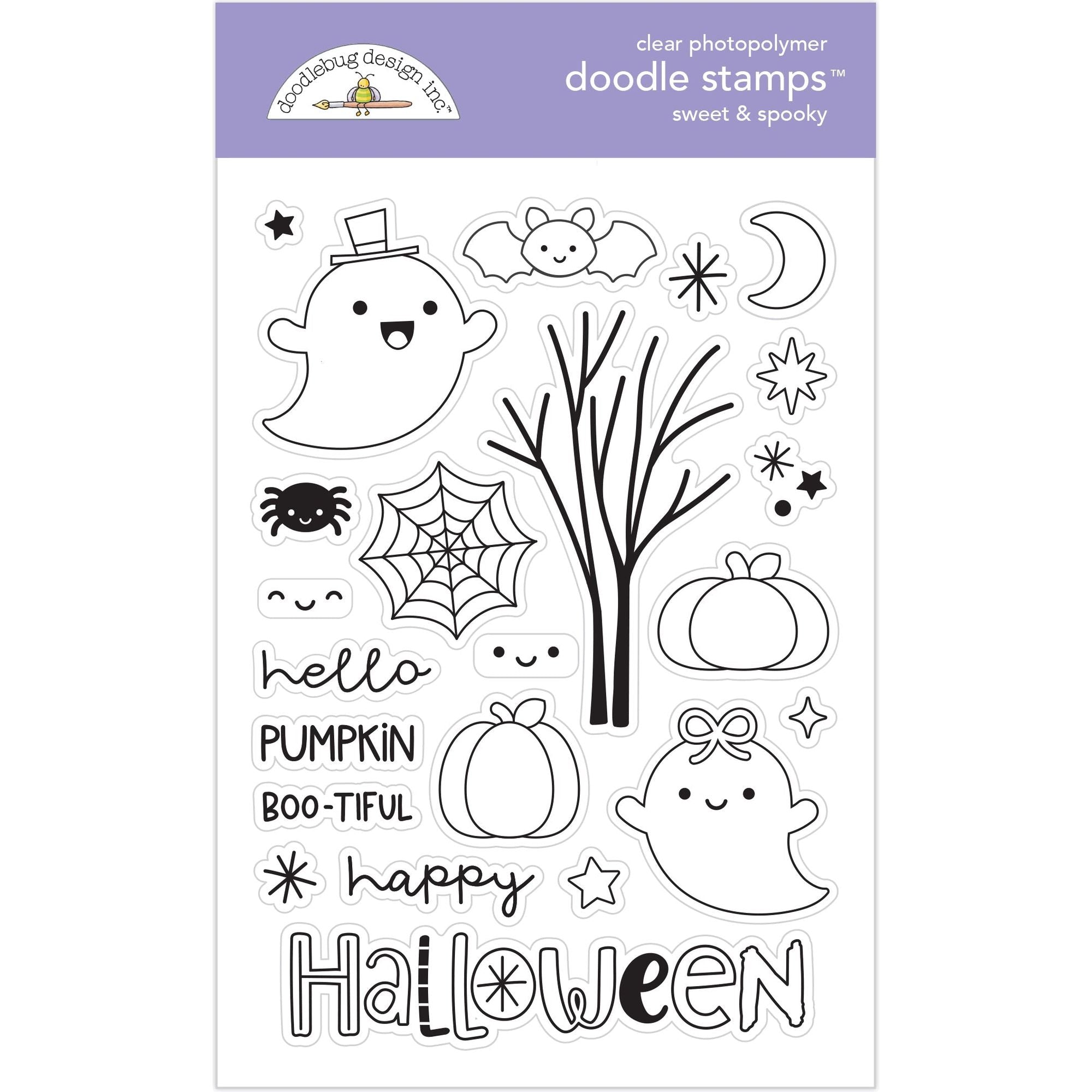 Doodlebug Sweet and Spooky Clear Stamps is a 4x6 inch stamp set for Halloween-themed crafts. It features a ghost with top hat, bat, tree, crescent moon, stars, asterisks, sparkles, spiderweb, spider, pumpkins, ghost with boo on head, and smiley faces to create unique, festive decorations. Perfect for seasonal crafting projects!