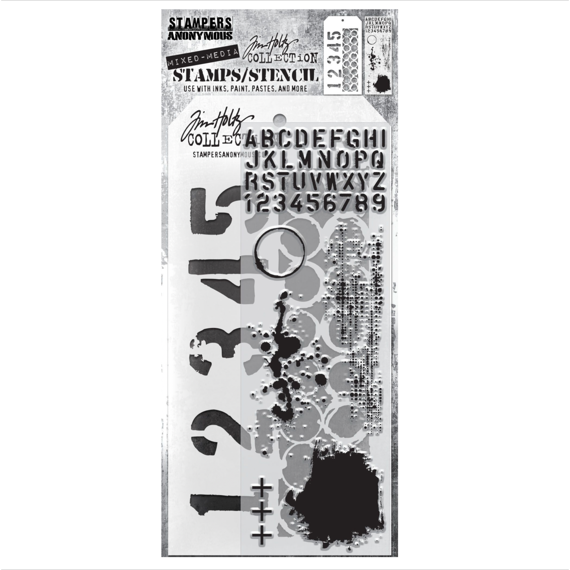 Tim Holtz Mixed Media Set includes clear stamps and a custom layering stencil designed to add texture and imagery to your creativity. Use with your favorite inks, paints, sprays, and pastes for endless mixed media possibilities.