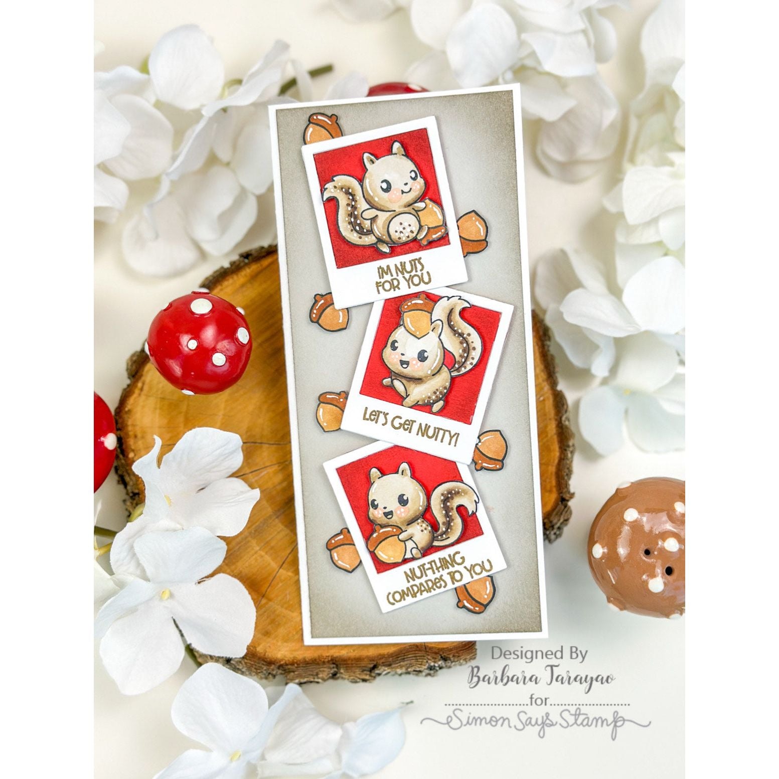 Add woodland whimsy to your projects with the Simon Says Stamp Nuts About You stamp set. This charming collection features stylized, adorable squirrels along with a cozy cabin nestled beside a tall tree, perfect for building nature-inspired scenes.