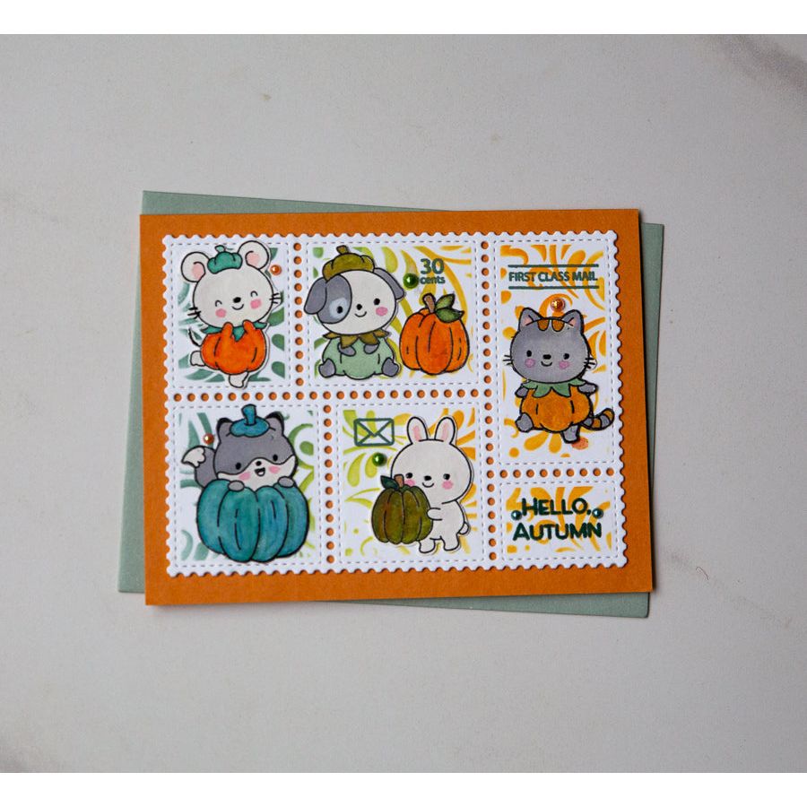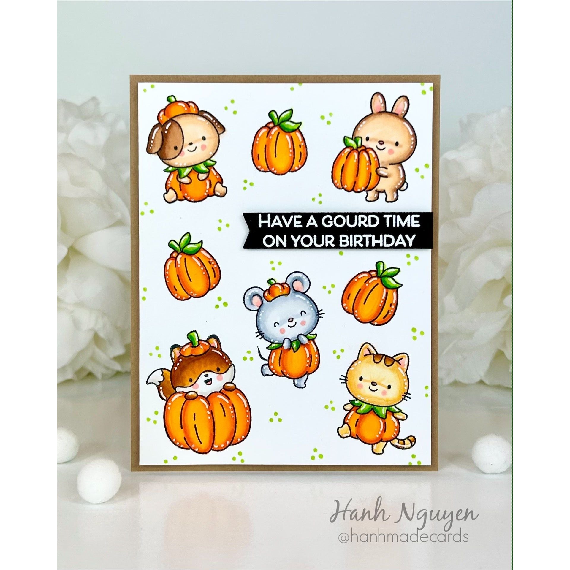 Celebrate the season with the Simon Says Stamp Pumpkin Pals stamp set. This adorable collection features cute critters—a mouse, dog, bunny, cat, and raccoon—posing with pumpkins or dressed in whimsical pumpkin costumes.