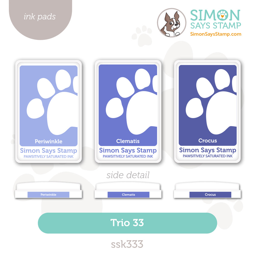 Introducing the Simon Says Stamp Pawsitively Saturated Ink Pad Trio 33! This set includes three full-sized saturated dye ink pads in purplish blue tones. The colors in Trio 33 are: