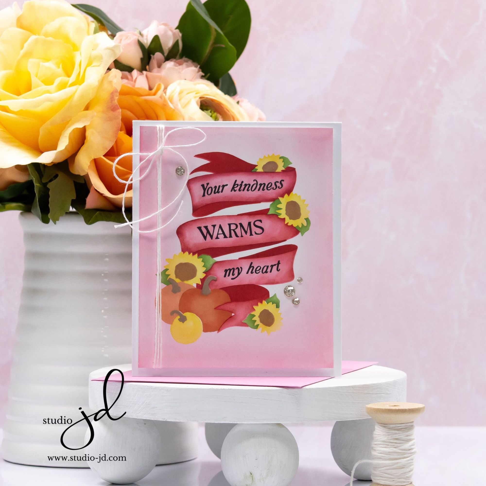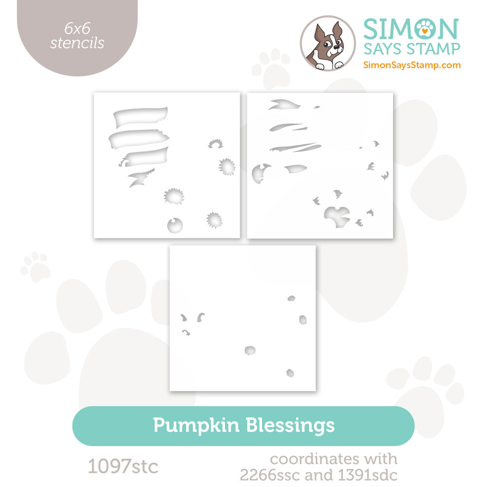 Add rich autumn color to your projects with the Simon Says Stamp Pumpkin Blessings stencils. This layering stencil set allows you to easily blend hues onto a ribbon banner intertwined with pumpkins and sunflowers, capturing the beauty of the season.