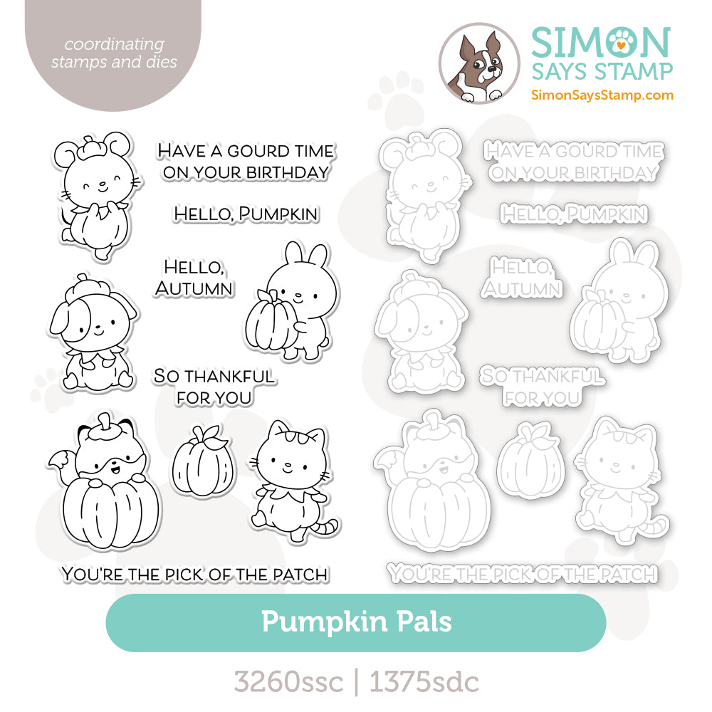 Celebrate the season with the Simon Says Stamp Pumpkin Pals stamp and die set. This adorable collection features cute critters—a mouse, dog, bunny, cat, and raccoon—posing with pumpkins or dressed in whimsical pumpkin costumes.