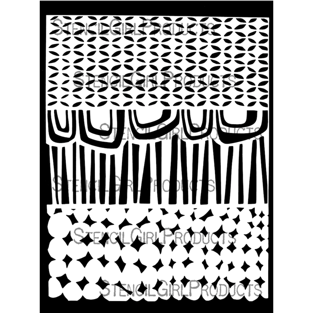The Modern Trifecta Stencil by Susan Rossiter features three distinct mid-century inspired patterns combined into one versatile design. Perfect for creating bold patterned papers, this stencil is ideal for cutting up and reassembling into collage elements. It also works beautifully for adding layered areas of interest to mixed media paintings, sketchbooks, or journals. With its clean retro lines and dynamic shapes, Modern Trifecta brings a playful yet sophisticated edge to your creative projects.