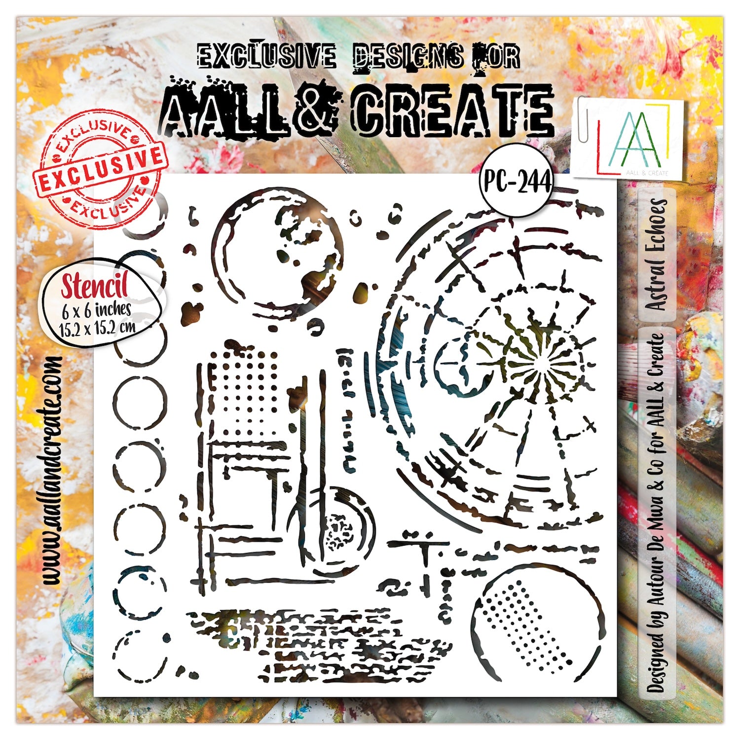 AALL & Create Astral Echoes Stencil, designed by Autour De Mwa & Co. for the Fractured Ecosphere Collection, measures approximately 6 x 6 inches and is crafted from high-quality, precision laser-cut 250-micron Mylar. This versatile stencil features a range of textures, including circles, lines, radii, splotches, and more, offering endless creative possibilities for your mixed media and crafting projects.