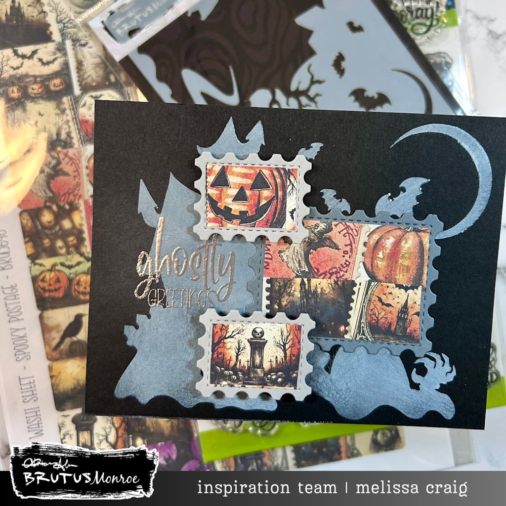 Brutus Monroe Paranormal Photo A2 Stencil brings a touch of spooky fun to your crafts. Measuring 4.25 x 5.5 inches, this stencil features a haunted house silhouette with eerie branches, a hand rising from the ground, flying bats, and a crescent moon—perfect for creating chilling Halloween scenes.