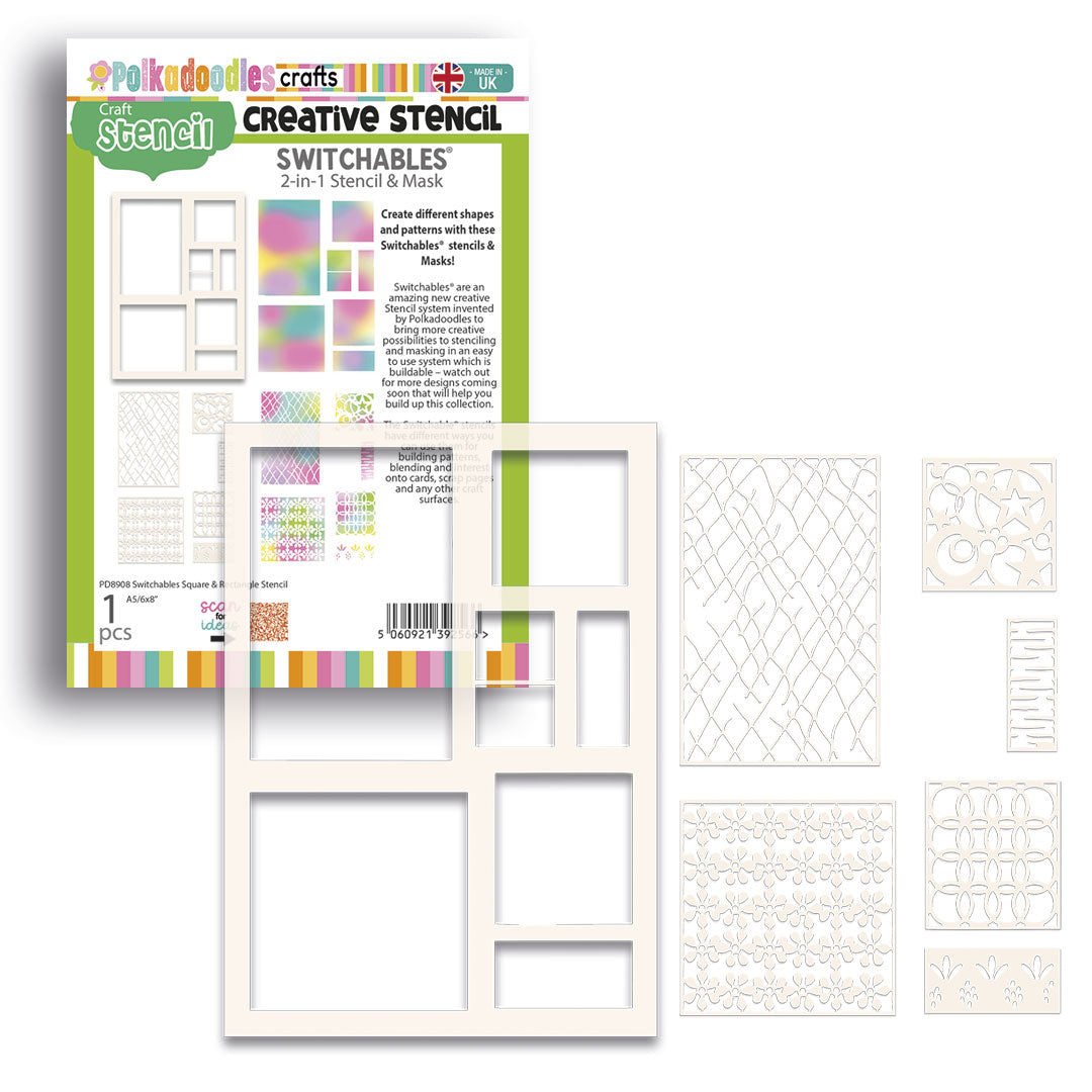 Switchables Squares and Rectangles Stencil, from the Hello Spring collection, feature blank frames, and templates with circles and stars, netting, flowers and other patterns. Switchables are a creative stencil system by Polkadoodles, designed to offer more possibilities in an easy-to-use, buildable format. This set includes one 6 x 8-inch, 190-micron mylar stencil that fits most card shapes but can also be layered for larger projects, plus additional masks.