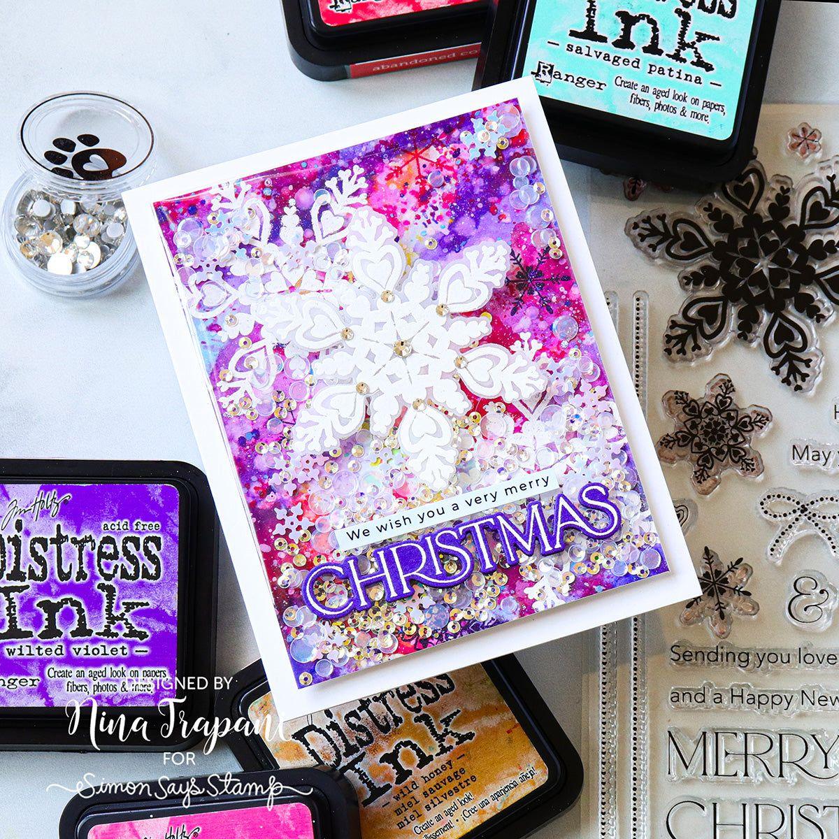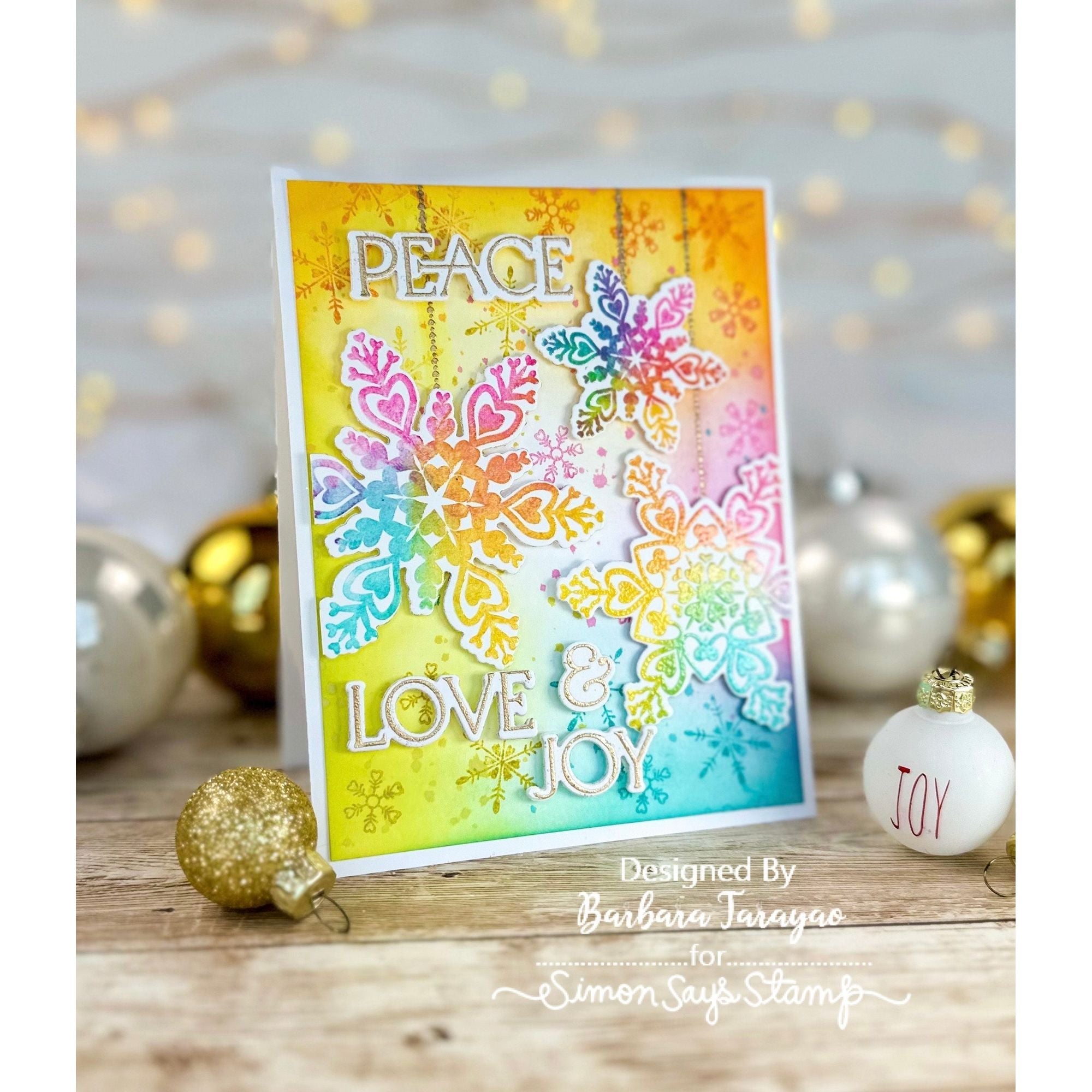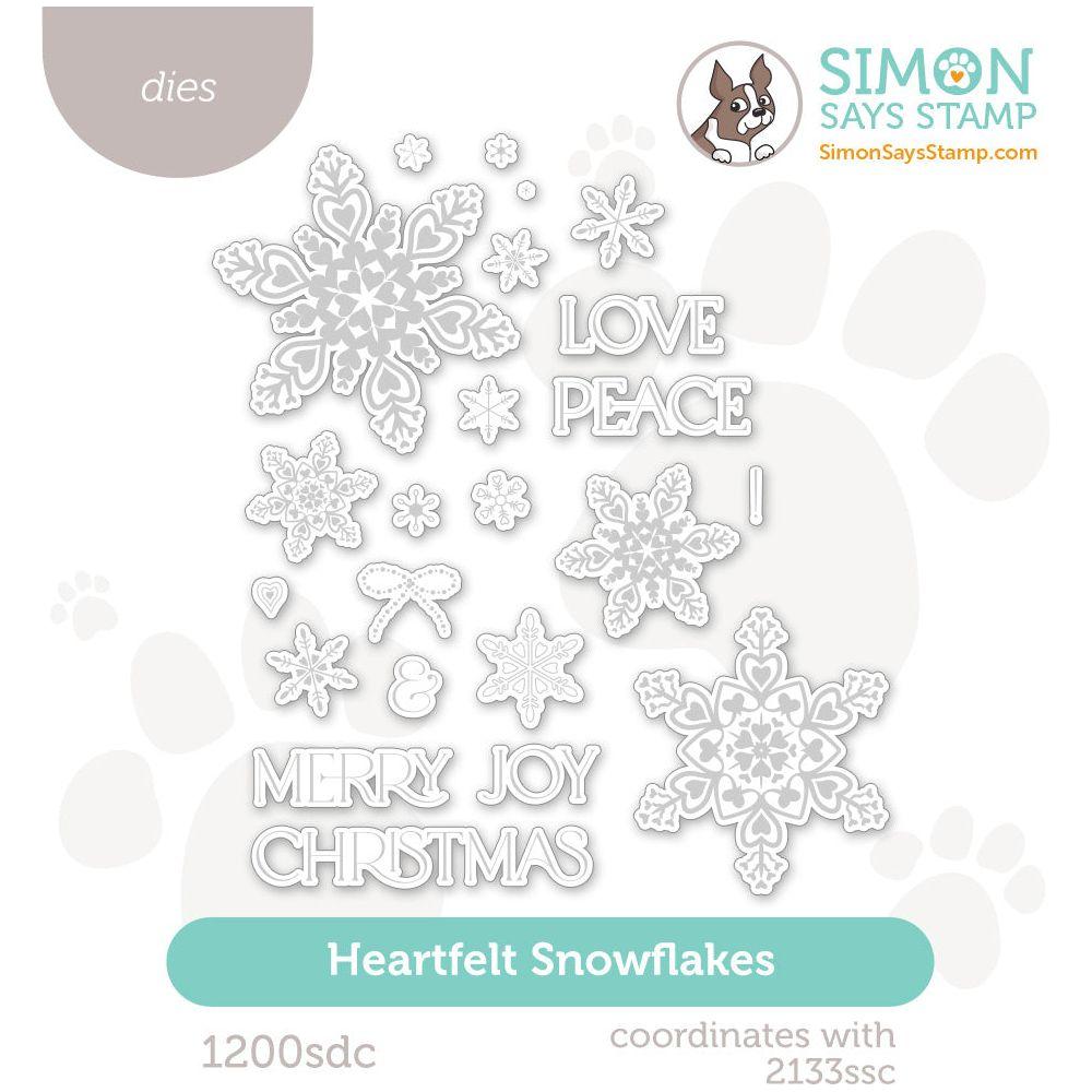 The Simon Says Stamp Heartfelt Snowflakes dies perfectly coordinate with the stamp set, cutting out all the snowflake images, heart, and bow.