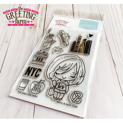 Immerse yourself in the ultimate city adventure with The Greeting Farm Anya In New York Stamps. Perfect for travel lovers and fashionistas alike, this continuation of the traveling stamp series features Anya in iconic NYC locations. Including fun and stylish supporting icons including a coffee cup, big apple, Statue of Liberty, Taxi cab, city skyline, heart, pretzel, NYC, and 'city girl' words, this 4x6 inch clear stamp set captures the essence of the city that never sleeps.