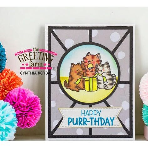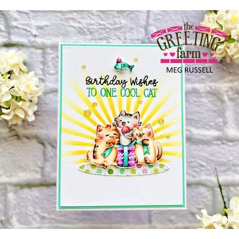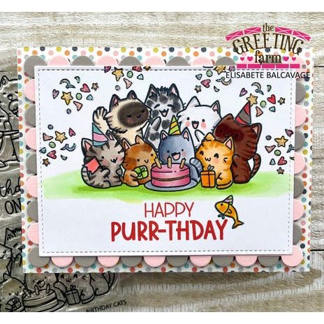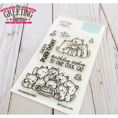Create the PURRfect birthday card for a cat lover with The Greeting Farm Birthday Cats Clear Stamps. This 9-piece 4x6 inch set features a large group of kitties celebrating with a cake, opening presents, and partying with confetti. The set also includes a slice of cake, a fish with a party hat, and two sentiments to complete the card. The grouped imagery is also great to create a 'from all of us' card! Sentiments included: