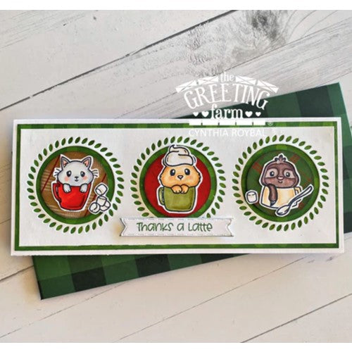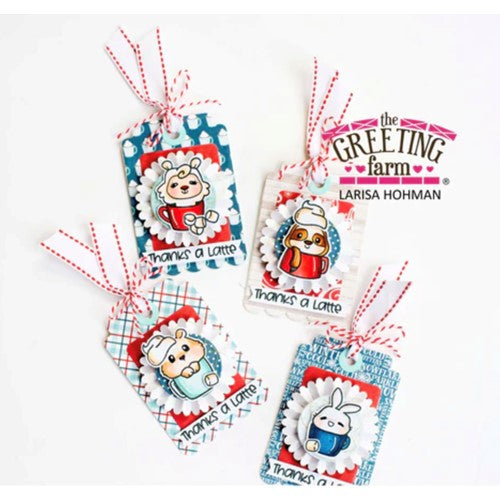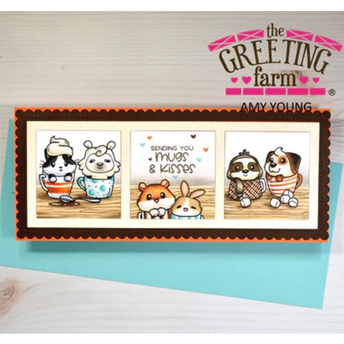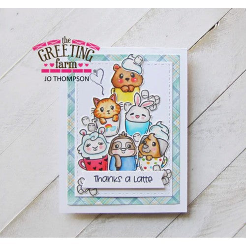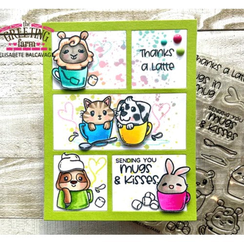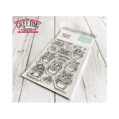 Who doesn't love a hug in a mug?! This sweet 4x6 inch clear stamp set contains 18 unique stamps with scenes of cute critters popping out of a mug and accessories for cocoa, coffee, and tea as well as the following sentiments: Thanks a latte, Hugs in a mug, Sending you mugs and kisses.