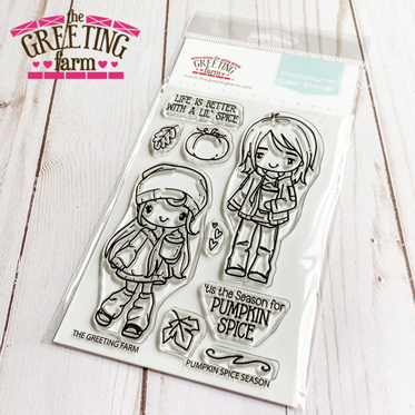 Add some autumn charm to your crafts with The Greeting Farm Pumpkin Spice Season Stamps. This 4x6 inch stamp set features a cute boy and girl couple dressed for the season, a pumpkin, two leaves, hearts, and two sentiments. Perfect for creating cozy fall-themed cards and crafts. Sentiments included: