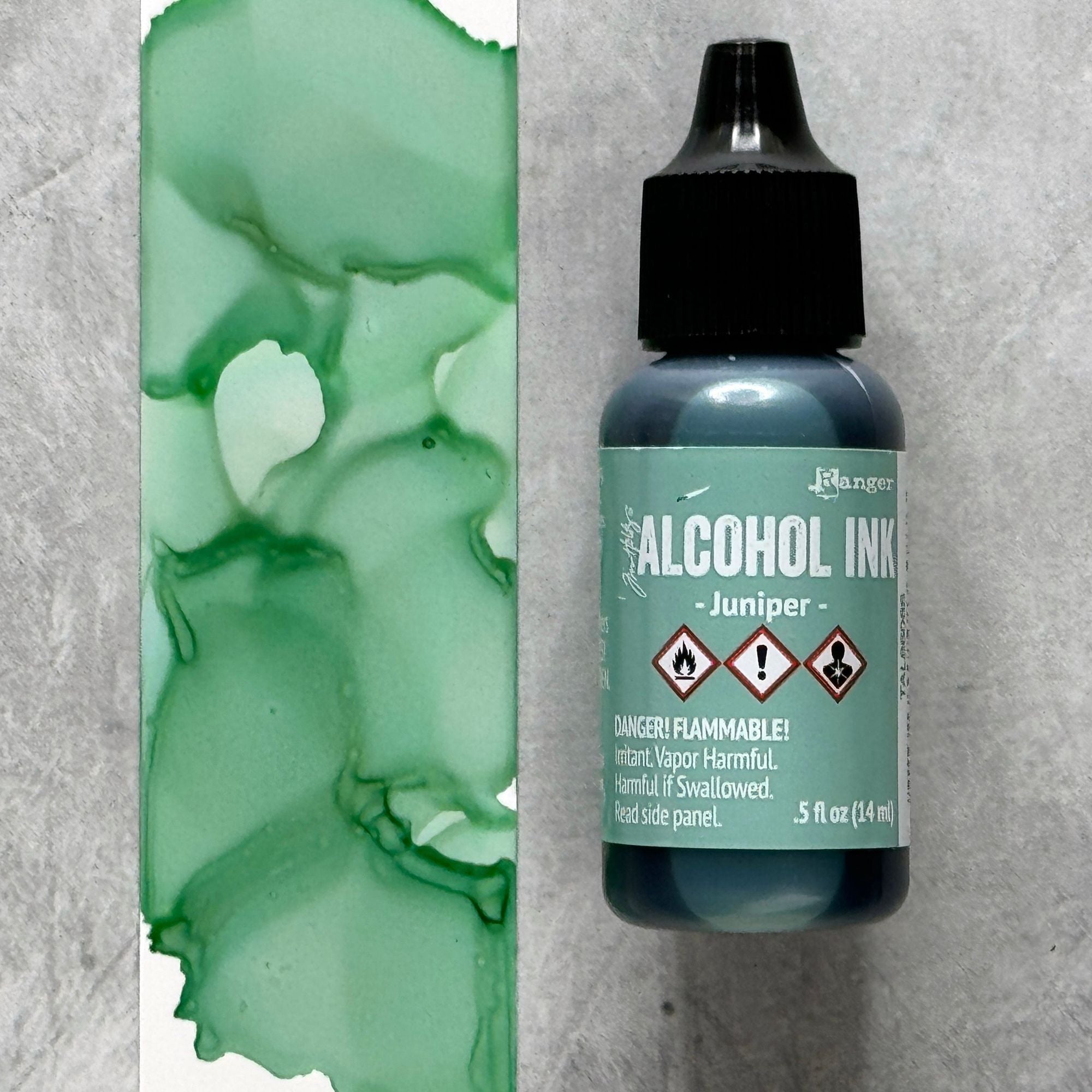 Effortlessly express your creativity with the luxurious Tim Holtz® Alcohol Ink Juniper. These premium, quick-drying inks are specially crafted to produce stunning color blends on impermeable surfaces. Perfect for applying on Alcohol Ink Dura Lar, Yupo®, Cardstock, Foil, Glossy Paper, and more. Unleash your artistic potential by experimenting with metal, glass, and glazed tiles. Each bottle contains 0.5 fl oz (14ml) of high-quality ink.