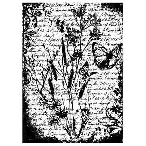 The stamp features a fun background collage of butterflies, delicate wildflowers, worn corners, and a script text overlay! It measures approximately 2.5 x 3.5 inches.