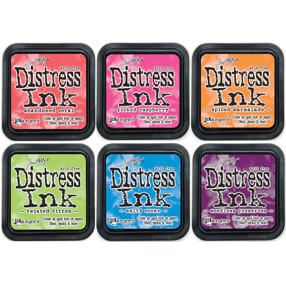 Tim Holtz Distress Inks are a collection of acid-free, non-toxic, fade resistant, water-based dye inks. They are perfect for the vintage, stained, aged effect that crafters are creating in their altered books, scrapbook pages, cards and paper craft projects. Tim selected the colors and helped develop these inks to produce a realistic, weathered look on paper, photos and decorative fibers. All the colorful Distress Inks afford added versatility when photo tinting and color layering with the original, award winning tones. The 3 x 3 inch pads are made with a raised felt for easier use with direct to paper techniques and inking up larger stamps.