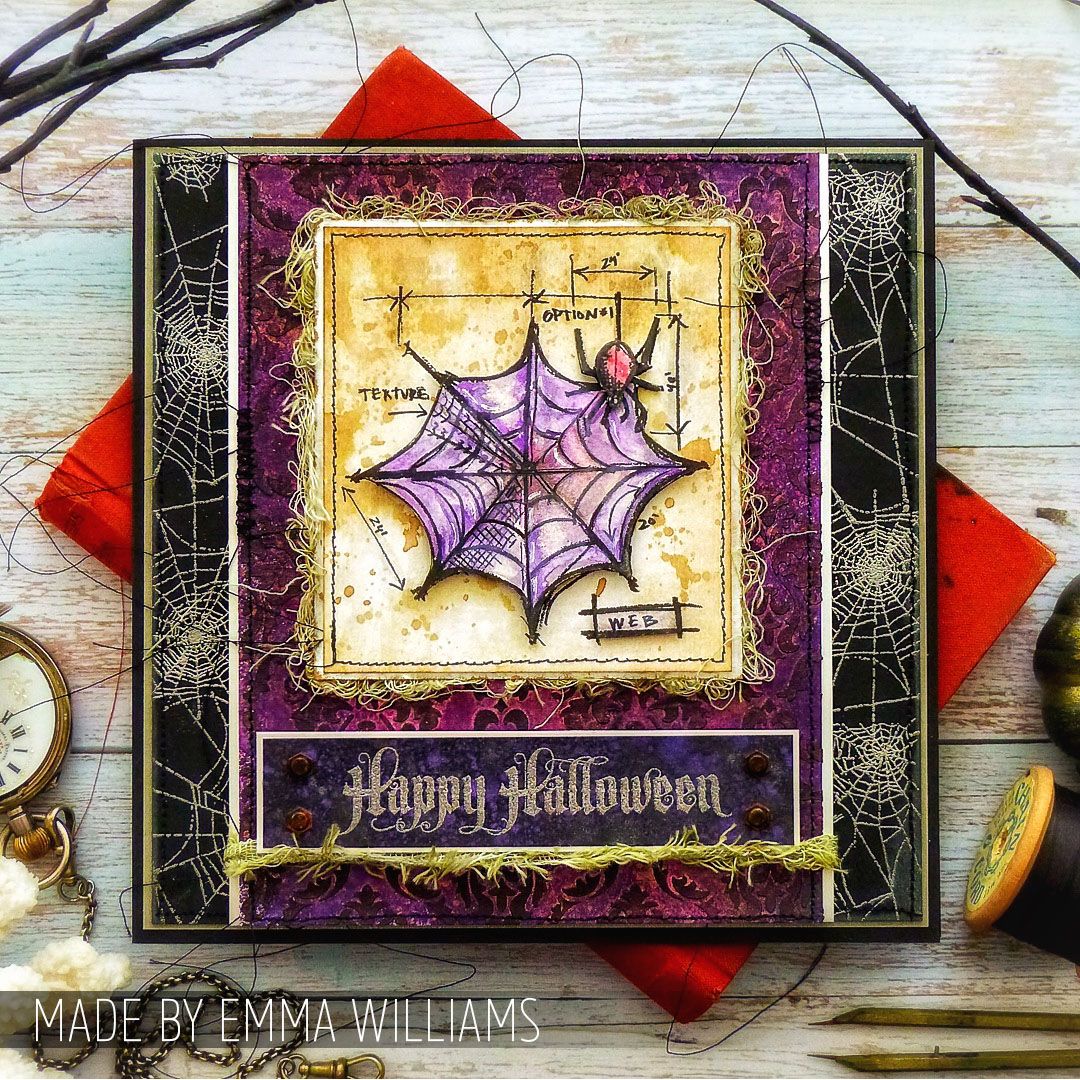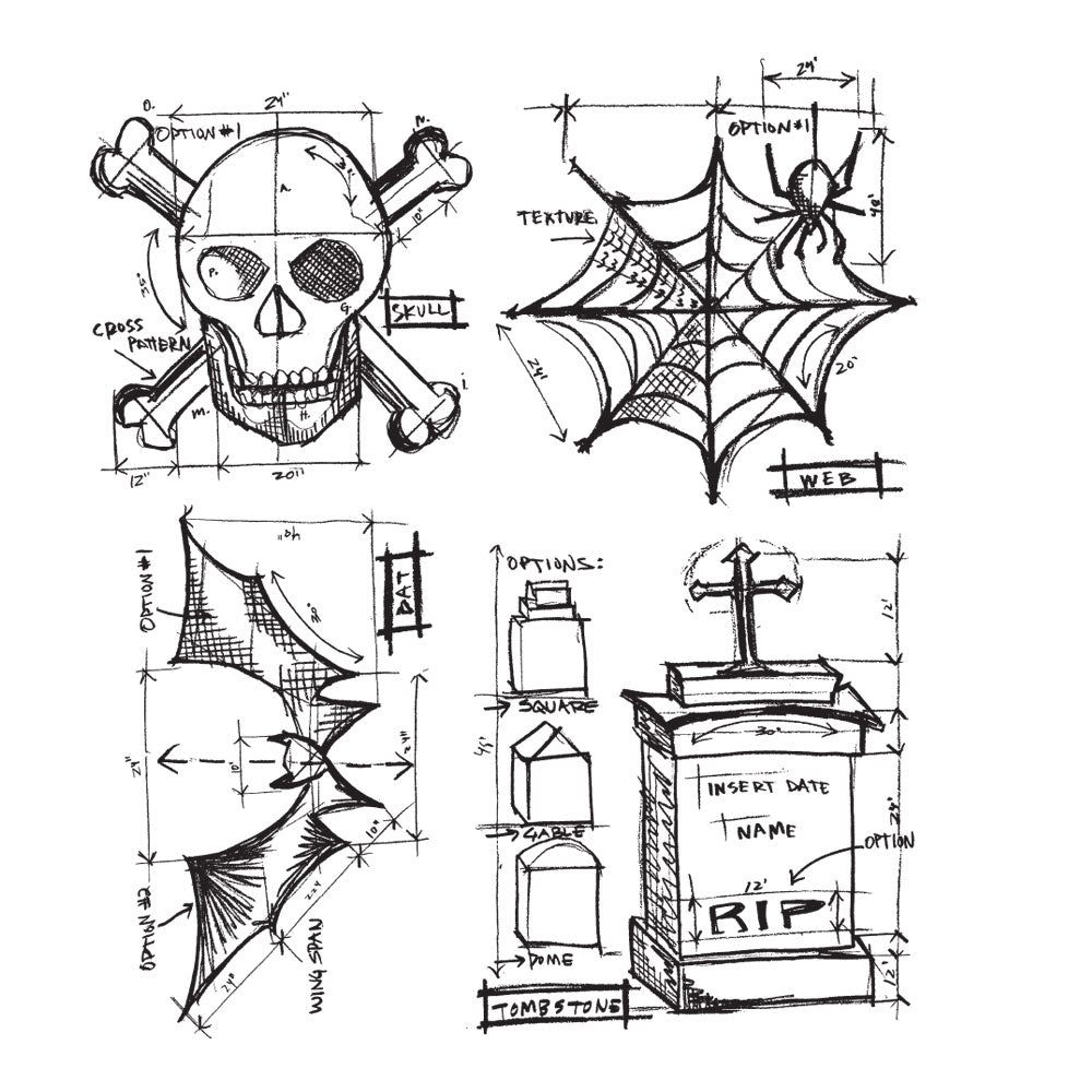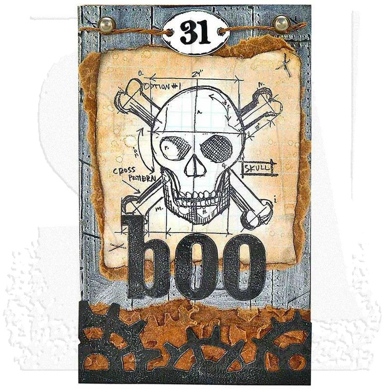 Tim Holtz Cling Rubber Stamps Halloween Blueprints set includes 4 deeply etched red rubber cling mount stamps that adhere to any clear acrylic block, sold separately. With Images curated by Tim Holtz, this set features blueprint drawings of a skull and crossbones, a spiderweb with a spider, a bat with open wings, and a tombstone. Proudly made in the USA by Stampers Anonymous, these high-quality rubber stamps provide crisp, detailed impressions, perfect for mixed media, and papercrafting. Stamps come on a 3-hole punched sheet for easy storage. The full stamp sheet measures 7.0 x 8.5 inches.