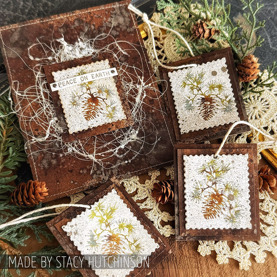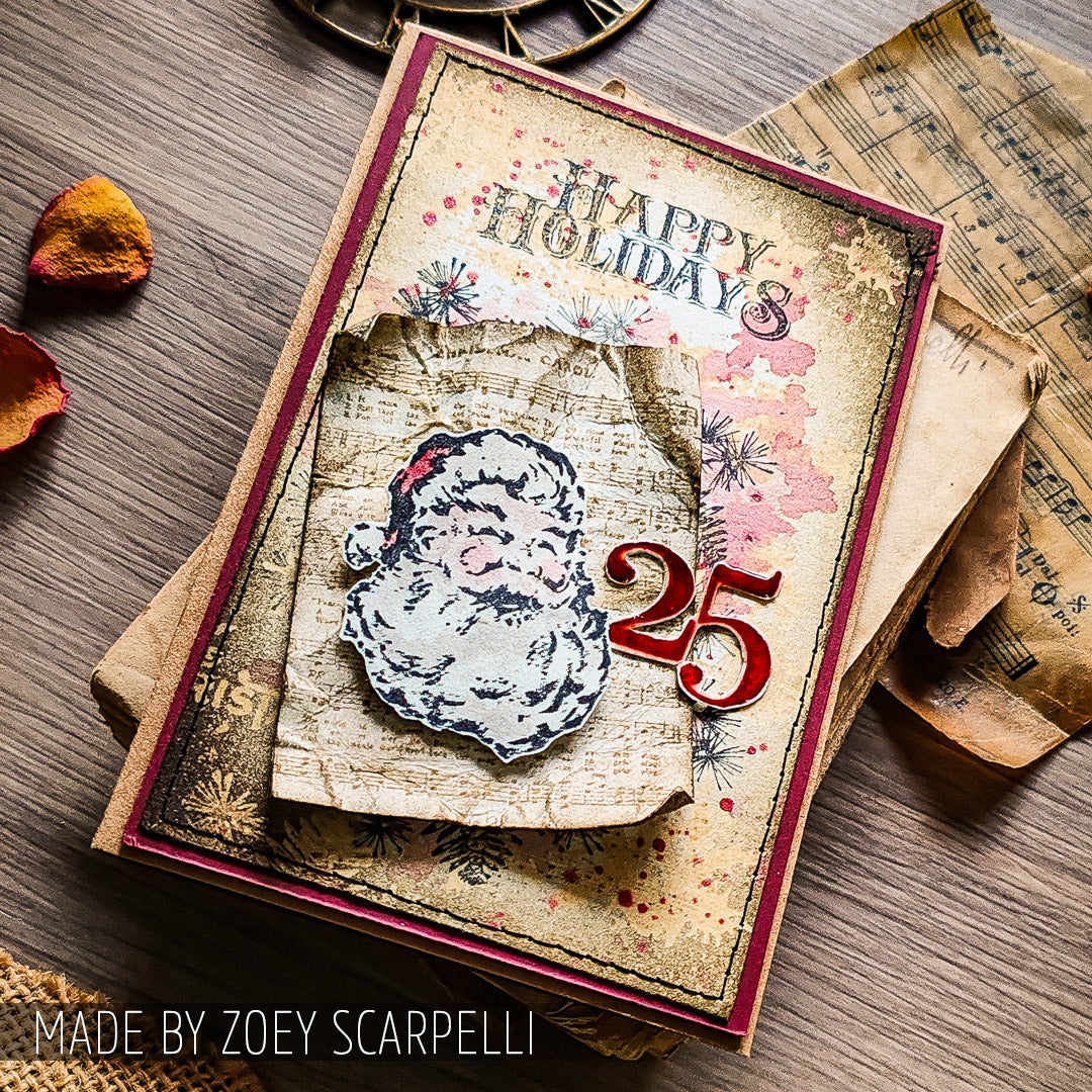 Tim Holtz Cling Rubber Stamps Mini Holiday 3 is a set of 11 deeply etched red rubber cling mount stamps that adhere to any clear acrylic block, sold separately. Stamps are mounted on 0.125 inch gray static cling cushion for fine detail. With Images curated by Tim Holtz, this set features a vintage Santa, a tree, Christmas carol sheet music, pine branches, snowflakes, and various forms of the sentiment Merry Christmas. Proudly made in the USA by Stampers Anonymous, these high-quality rubber stamps provide crisp, detailed impressions, perfect for mixed media and papercrafting. Stamps come on a 3-hole punched sheet for easy storage. The full stamp sheet measures 7.0 x 8.5 inches.