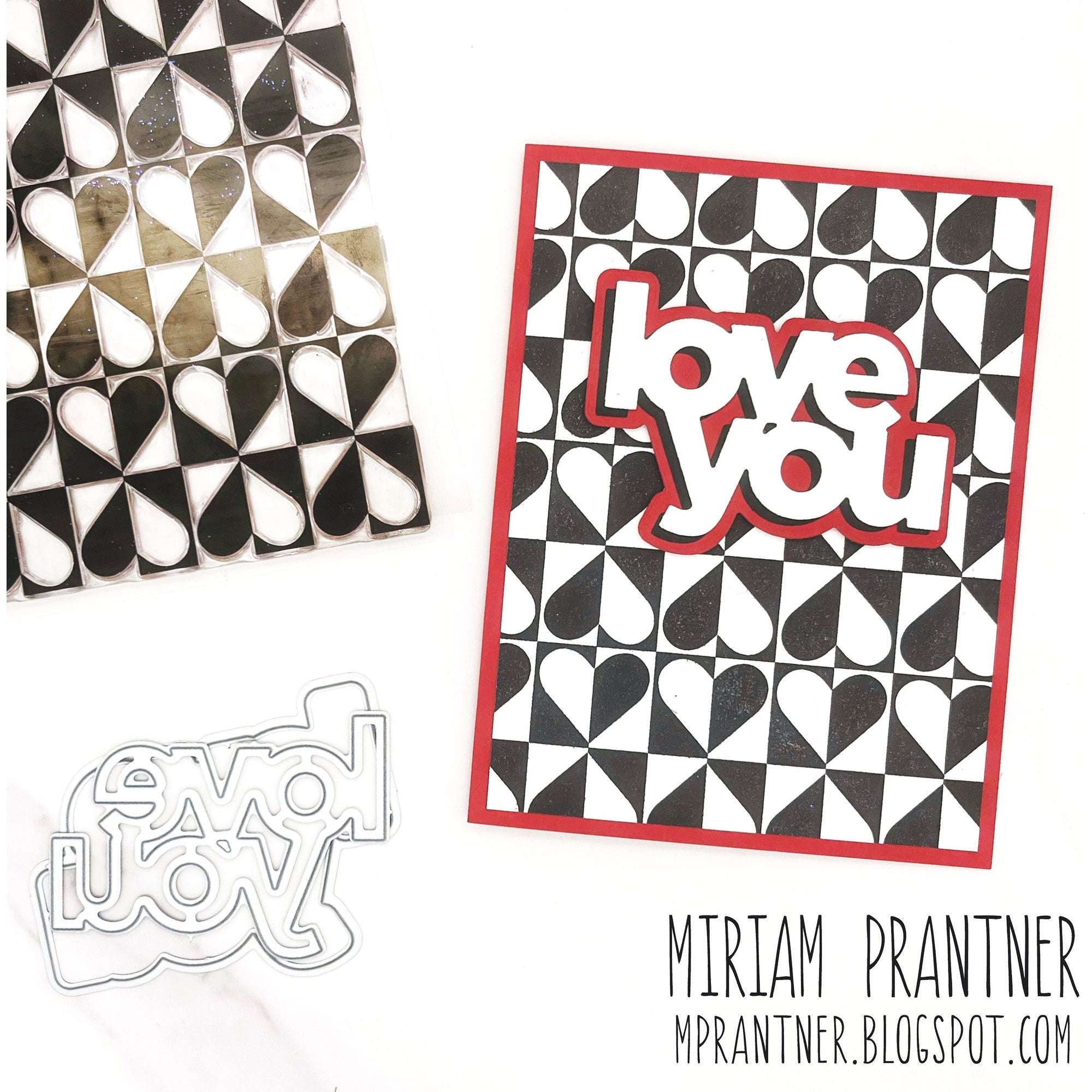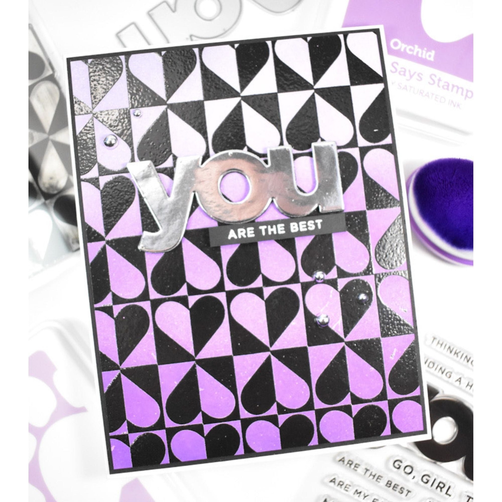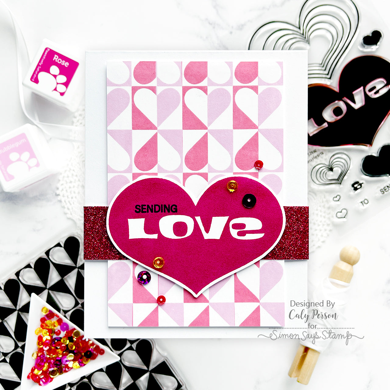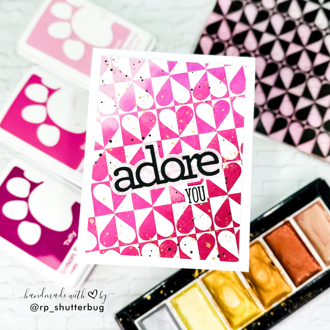The Simon Says Stamp Harlequin Heart stamp creates a striking allover pattern featuring rows of hearts nestled inside divided squares. Each square is cleverly split, with one half showcasing the positive space of the heart and the other half highlighting the negative space of the square with the heart half inside.