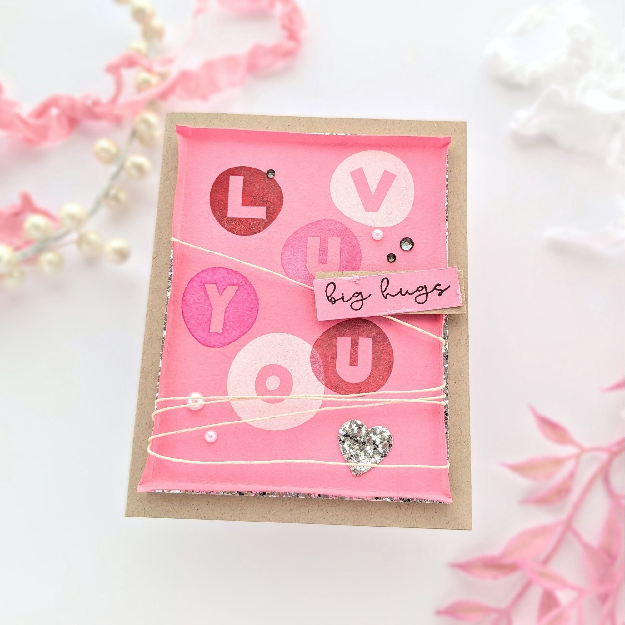 This clever set features imperfect solid circle stamps with letters and a heart creatively designed in the interior negative space. Pair these with the included solid and patterned shape stamps to add color and flair within the negative spaces or to create funky, stylized letters for a bold and modern look. With the letters i, L, o, v, e, Y, U, and H, you can create these words and phrases like these: