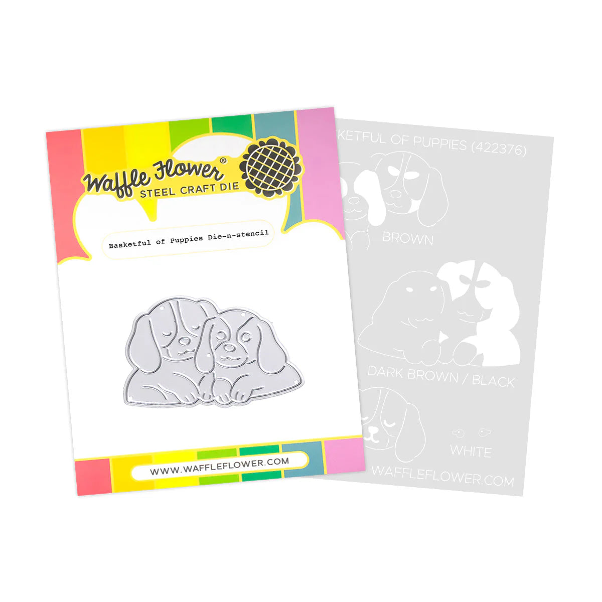 Waffle Flower Basketful of Puppies Die-n-stencil includes one die and a coordinating stencil that work together to create two adorable puppies. Use this set alongside the Basket Base Dies 422374, sold separately, to build a playful, scene-filled design.