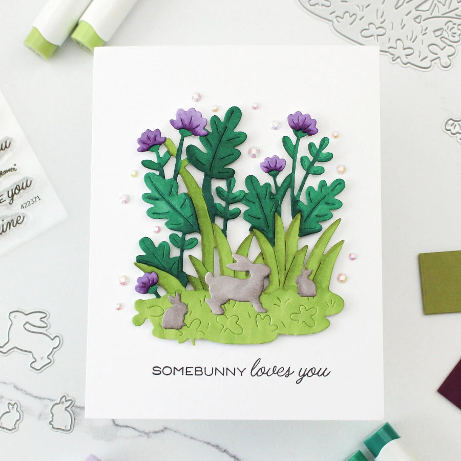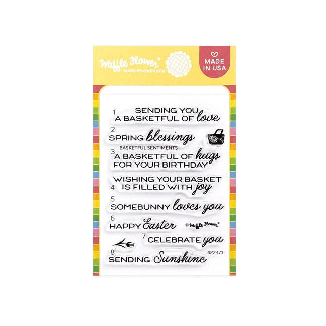 Waffle Flower Basketful Sentiments Clear Stamps is a 3 x 4 inch clear stamp set featuring 10 fun Easter and spring-themed sentiments. These cheerful and playful phrases are perfect for adding joyful messages to cards, tags, and other seasonal projects. For easy and polished cutouts, this set coordinates with the Basketful Sentiments Dies 422372, sold separately.