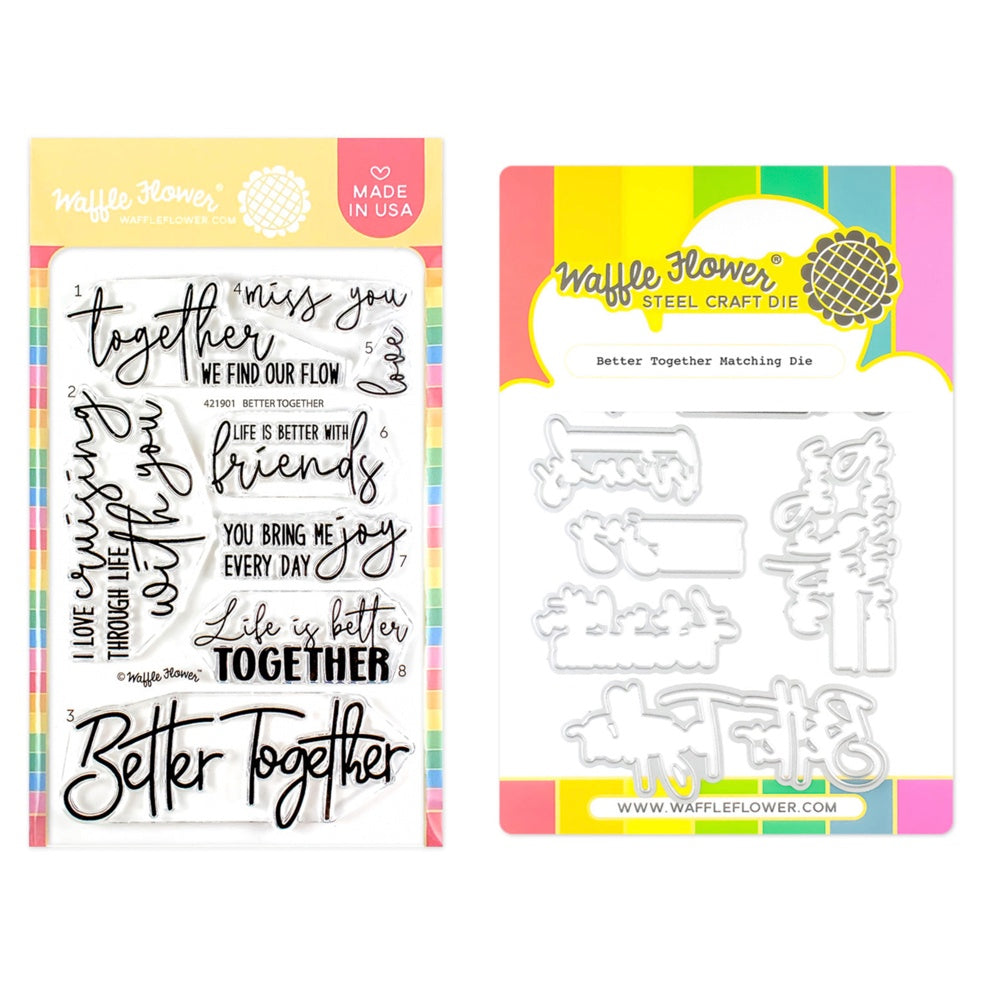 Waffle Flower Better Together Clear Stamp 421901 and Die 421902 sold together! The stamps are designed to celebrate friendship and connection. The set includes heartfelt sentiments in a mix of fonts and sizes, perfect for creating cards that support, uplift, or celebrate special bonds. The coordinating dies precisely cut out each sentiment, making it easy to add dimension to your projects. Compatible with most die-cutting machines.