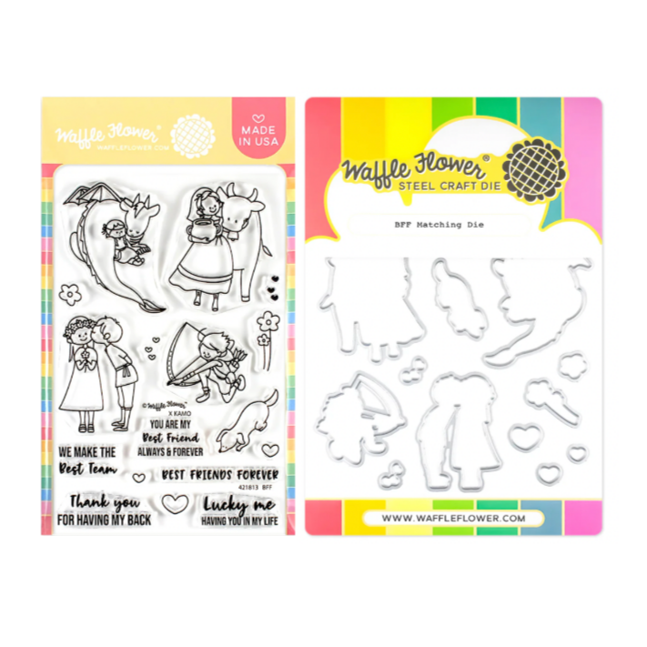 The Waffle Flower BFF Clear Stamp and Die Set celebrates the magic of fairytale friendships with whimsical character pairings and heartwarming sentiments. The 4 x 6 inch BFF Clear Stamps 421813 includes 17 images and phrases that can be colored with simple strokes or intricate blends to suit any style. The coordinating BFF Dies 421814 has 17 high-quality dies cuts out the stamped images with precision, adding dimension and polish to your projects. Both the stamps and dies work with leading die-cutting machines and are perfect for creating cards, scrapbook pages, and more.