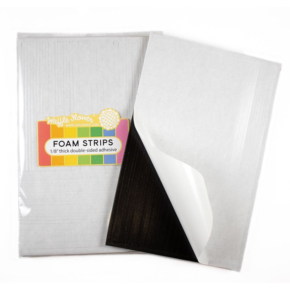 Designed for cardmakers by cardmakers, Waffle Flower Foam Strips are double-sided adhesives that are available in two thicknesses and varies lengths, up to 8.5 in for slimline cards. Each sheet in this set contains both .12 in or 3mm  and .24 in or 6 mm wide strips that are 0.0625 inch thick. Each sheet features a pre-cut frame that fits perfectly underneath an A2 panel or frame that is 0.25 inch or wider.