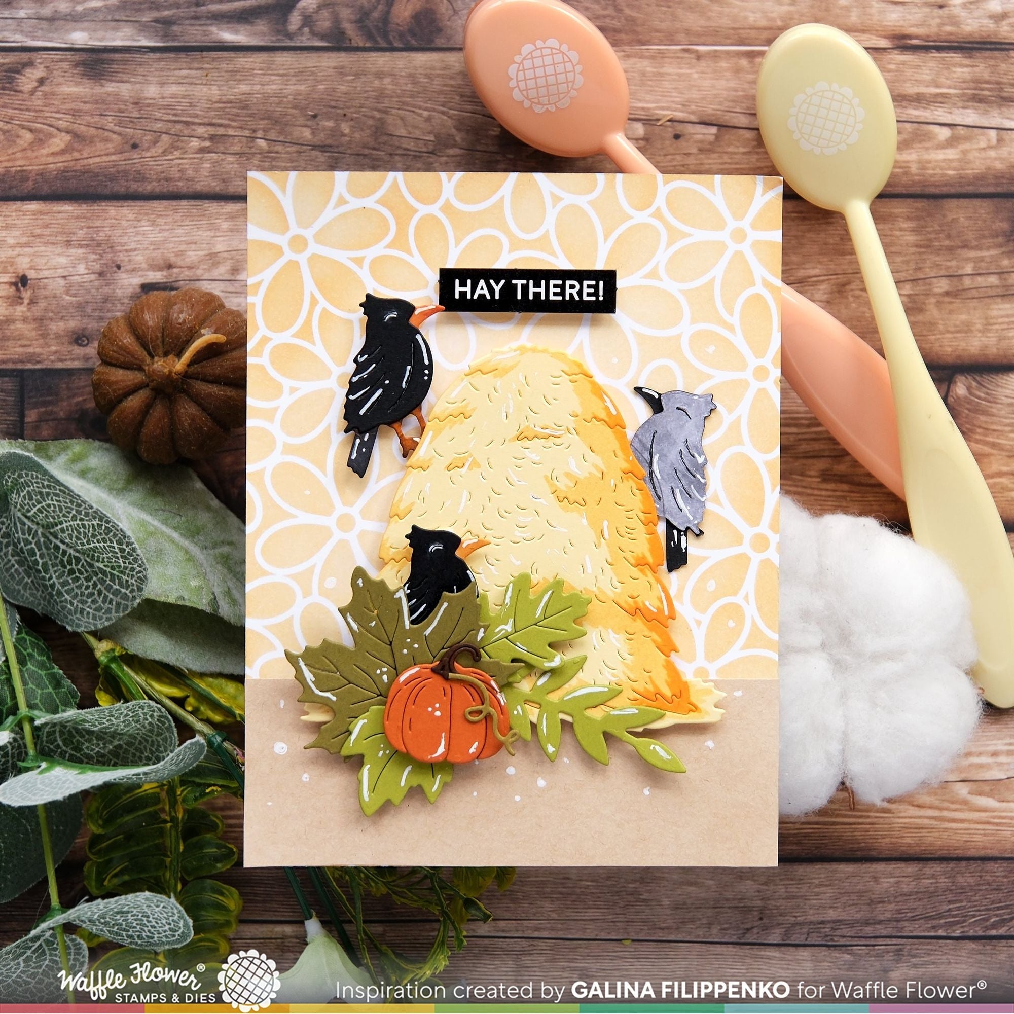 The Waffle Flower Hay There Die and Stencil set adds a charming stack of hay to the Fall release. It works perfectly as a supporting image for many fall icons, but can also stand alone for a playful hay there greeting card. Additionally, it serves as a delightful playground for small critter images too!