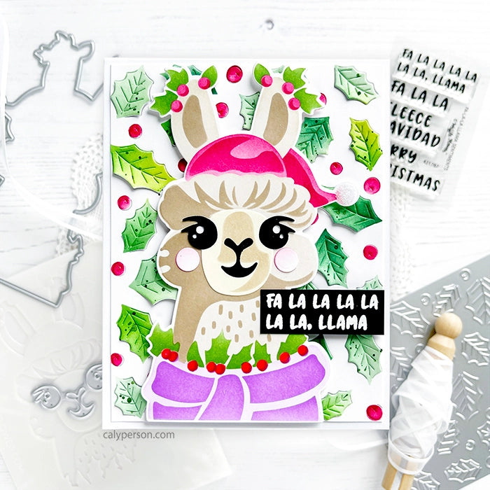 Create a fun and festive holiday background with the Holly Jolly Background die and stencil set. The panel die features a clever partial cut design of holly leaves and berries, while the stencil allows you to easily add color to your die cut background. The berries are on a separate layer of the stencil, making it easy to apply glitter paste for added shine.