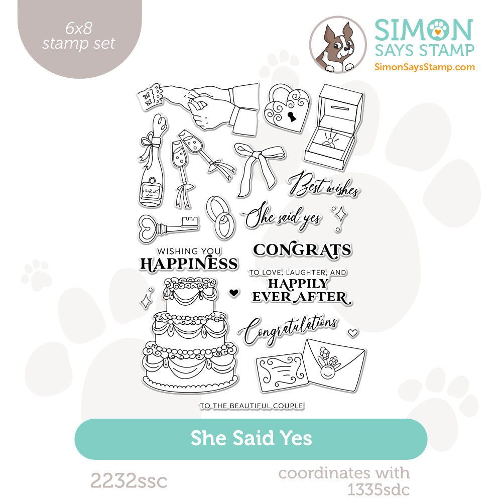 The Simon Says Stamp She Said Yes stamp set is a beautiful celebration of love and commitment, featuring elegant engagement and wedding-themed illustrations.