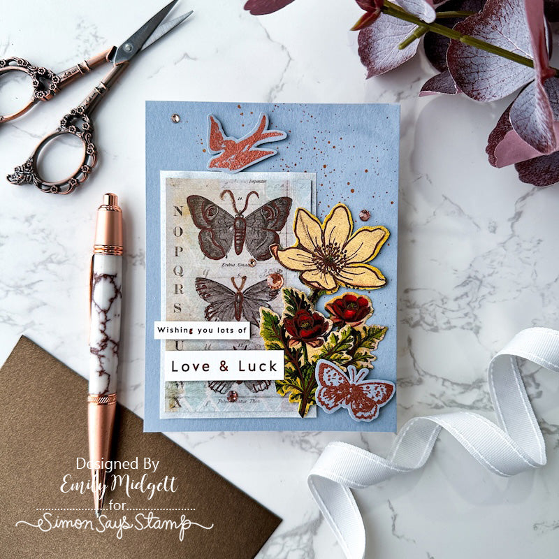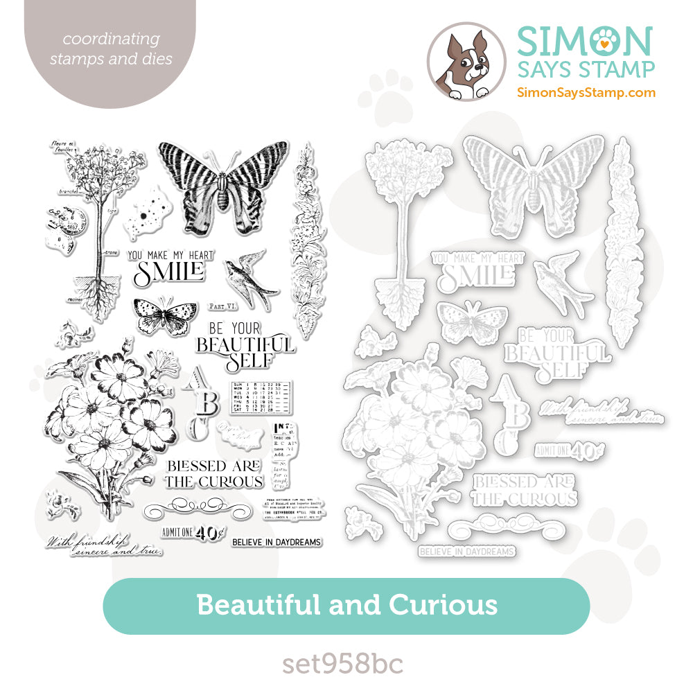 Embrace the charm of vintage artistry with the Simon Says Stamp Beautiful and Curious stamp and die set. Designed with a distinctly mixed media feel, this set features a stunning collection of detailed images including flowers, butterflies, birds, postmarks, a leafy swag, and elegant script elements.