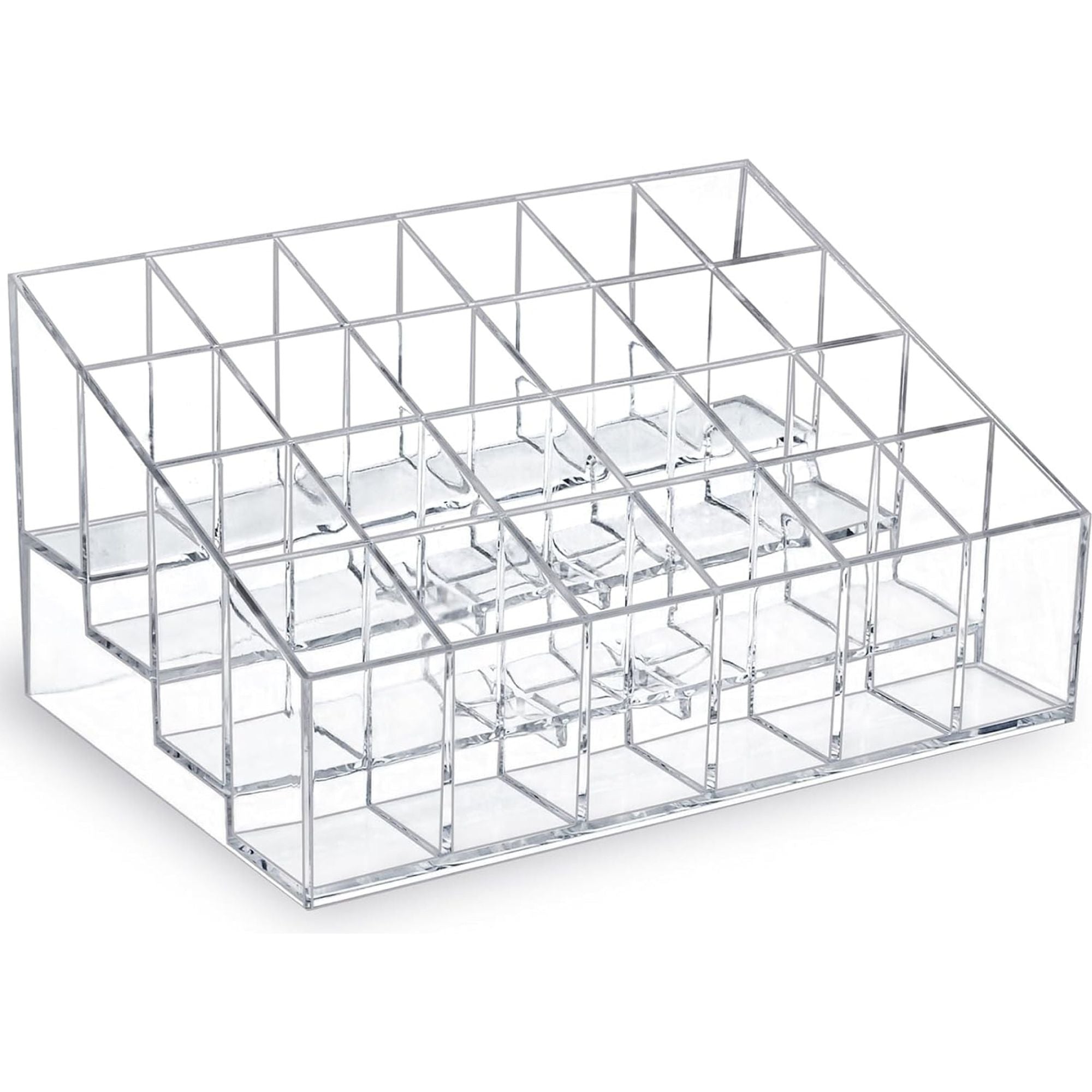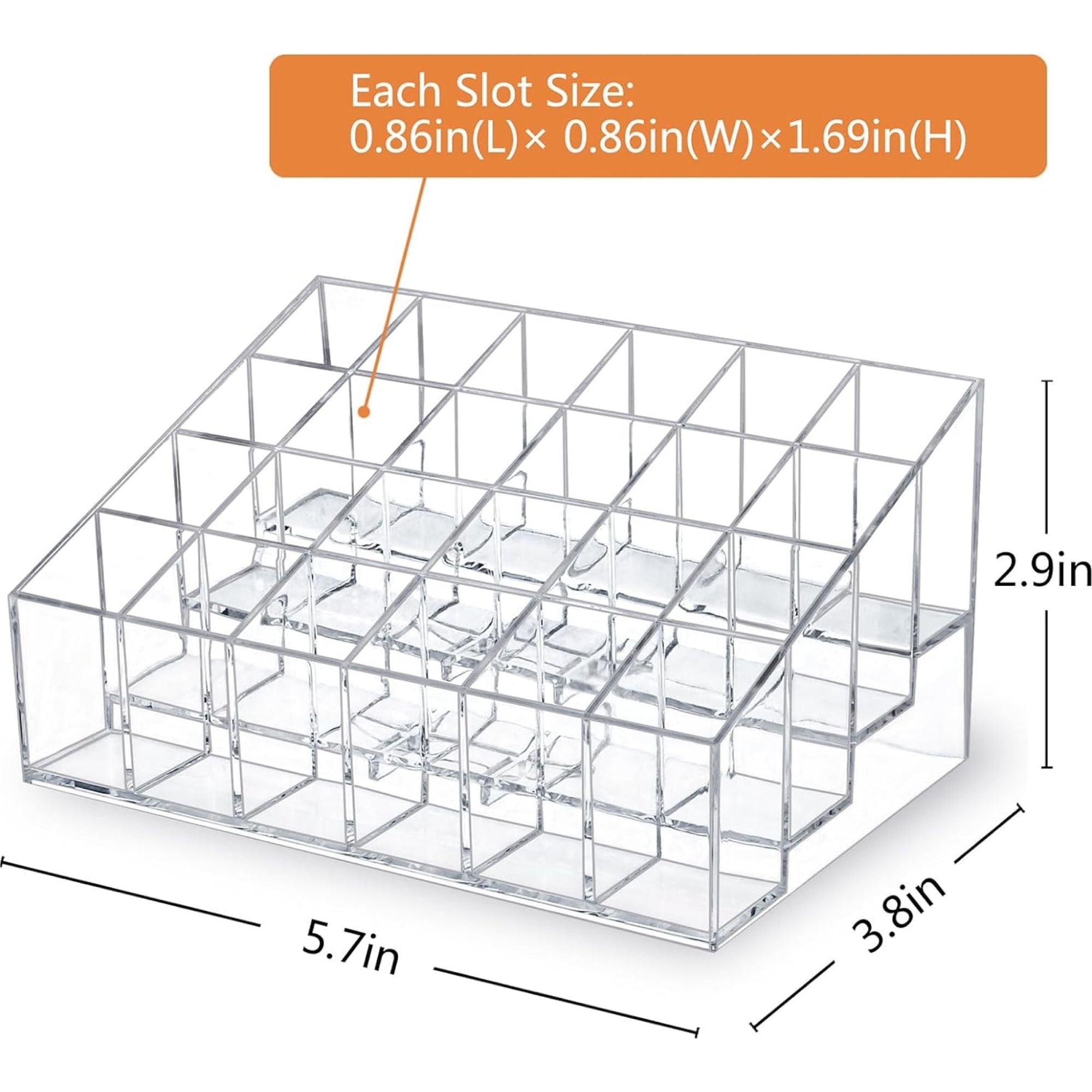 This clear compact 24-slot organizer boasts a size of 5.70(L)x3.8(W)x2.9(H) inches, with each slot measuring 0.86(L)×0.86(W)×1.69(H) inches. Its sleek design features a stepped arrangement of 4 rows and 6 columns, making it easy for you to showcase your favorite products. This elegant display case is perfect for both home and commercial use, serving as a chic and sophisticated storage solution for cosmetics and crafting tools. Plus, it's washable and makes for a thoughtful gift.