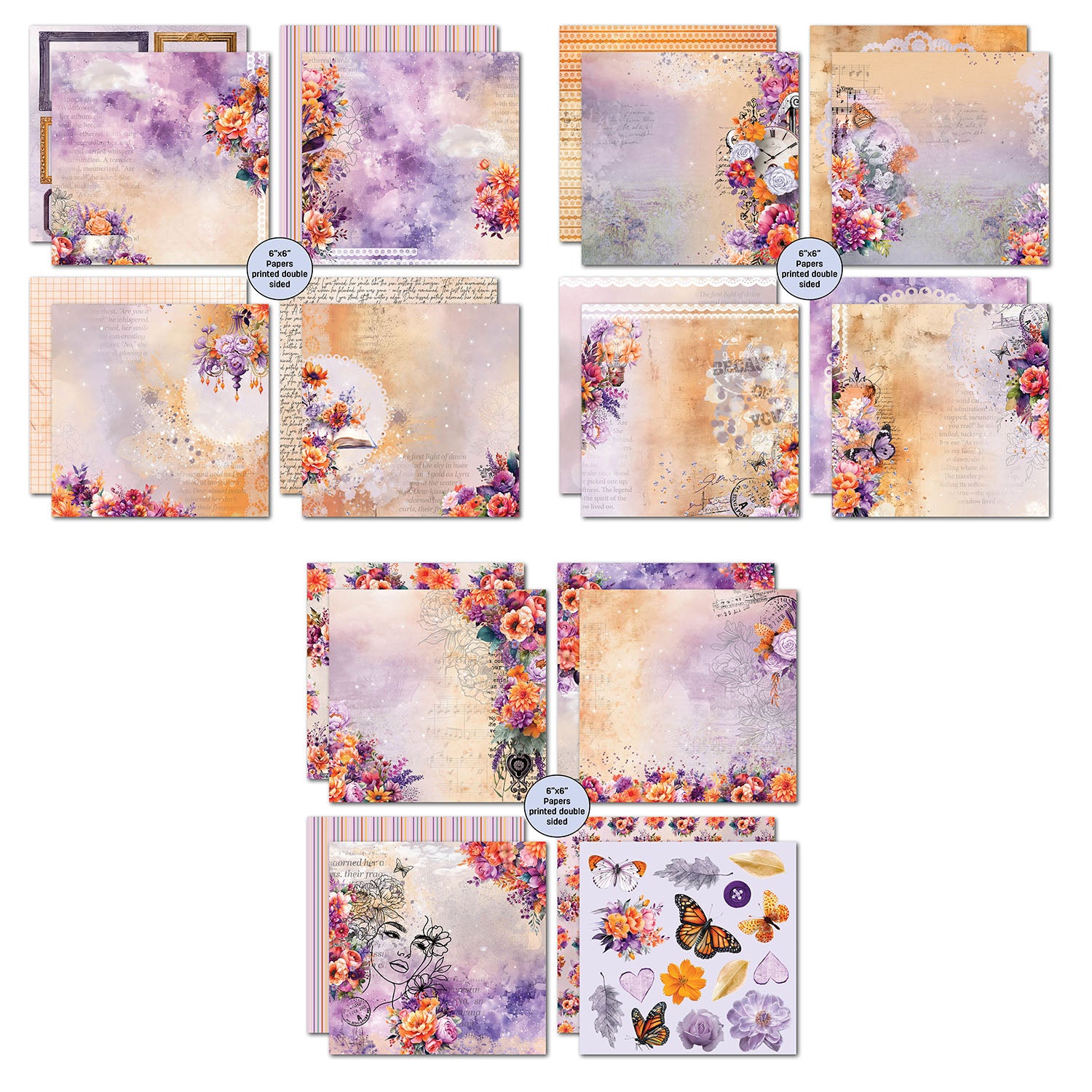 3Quarter Designs Dawn's Glow 6x6 Paper Pack showcases a striking blend of bright orange and purple hues inspired by sunrises and sunsets. Rich collages of florals, butterflies, and elegant script add depth and charm, making it a versatile choice for feminine, garden-themed, or special occasion projects such as weddings. The pack also includes a dedicated ephemera sheet featuring leaves, hearts, blooms, and butterflies. This 6 x 6-inch double-sided paper pack contains 12 sheets, perfect for cardmaking, scrapbooking, journaling, and mixed media creations.
